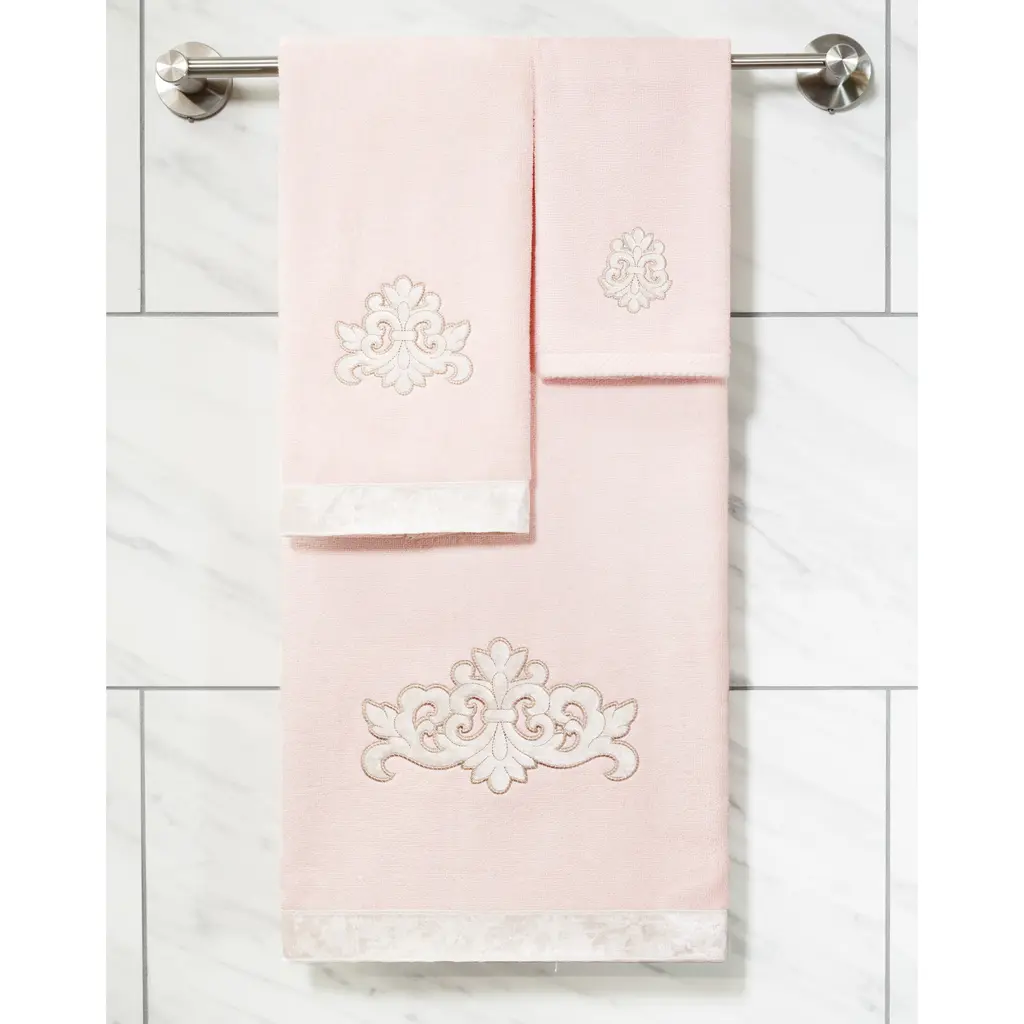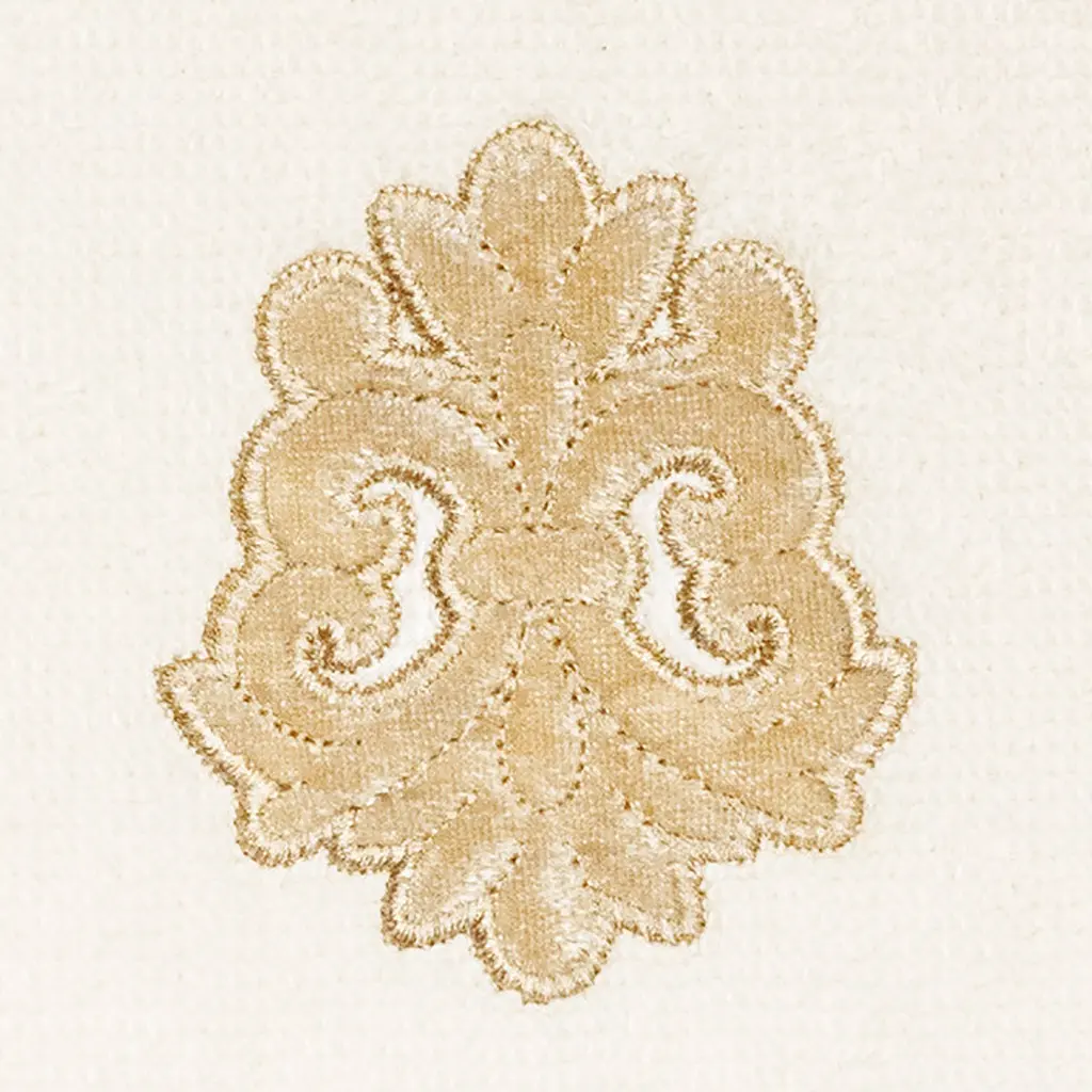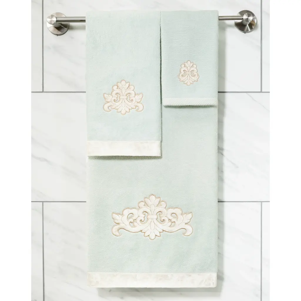 Your decorations are not complete without elegant embroidered towels by Authentic Hotel and Spa for the comfort of your family and guests. The May towels feature a classic velvet crest applique and are trimmed with the same lustrous velvet border. Cloud soft and super absorbent, these luxurious, durable towels keep their plush appearance after washing. This collection is available in 8 elegant colors: White, Beige, Blush, Aqua, Silver, Cocoa, Charcoal and Marine. The May Towel Collection brings a refined spirit and richness to your home decor and makes a great gift. Note: Due to variations in computer screen resolutions, slight color differences may exist between images provided and actual product.Embroidered Velvet Crest design100% Premium Turkish CottonSuperbly absorbent and quick dryingAvailable in 8 elegant colorsMachine wash cold, No bleach, line dry or dry cleanSet includes 2 fingertip towels (11" x 18")Made in TurkeyProudly Embellished in USA