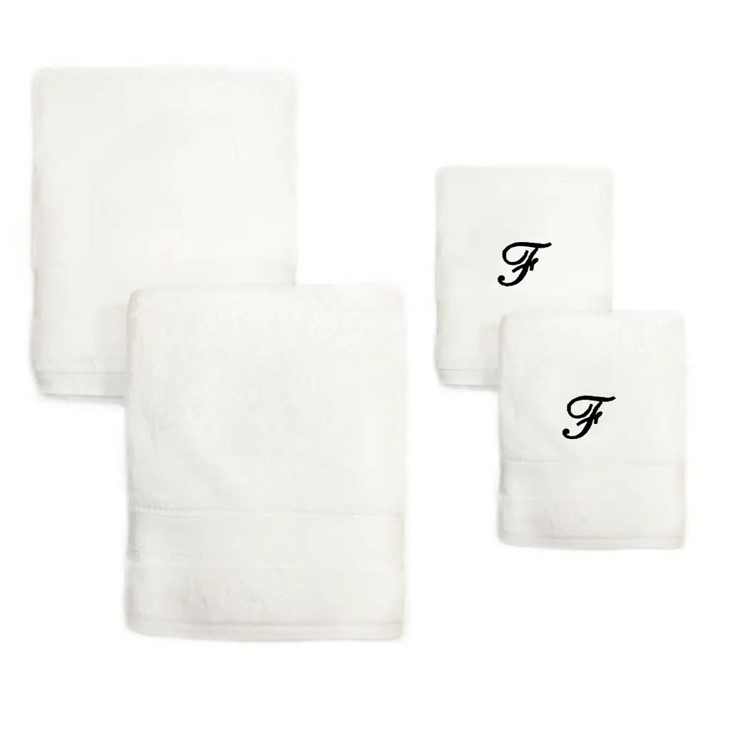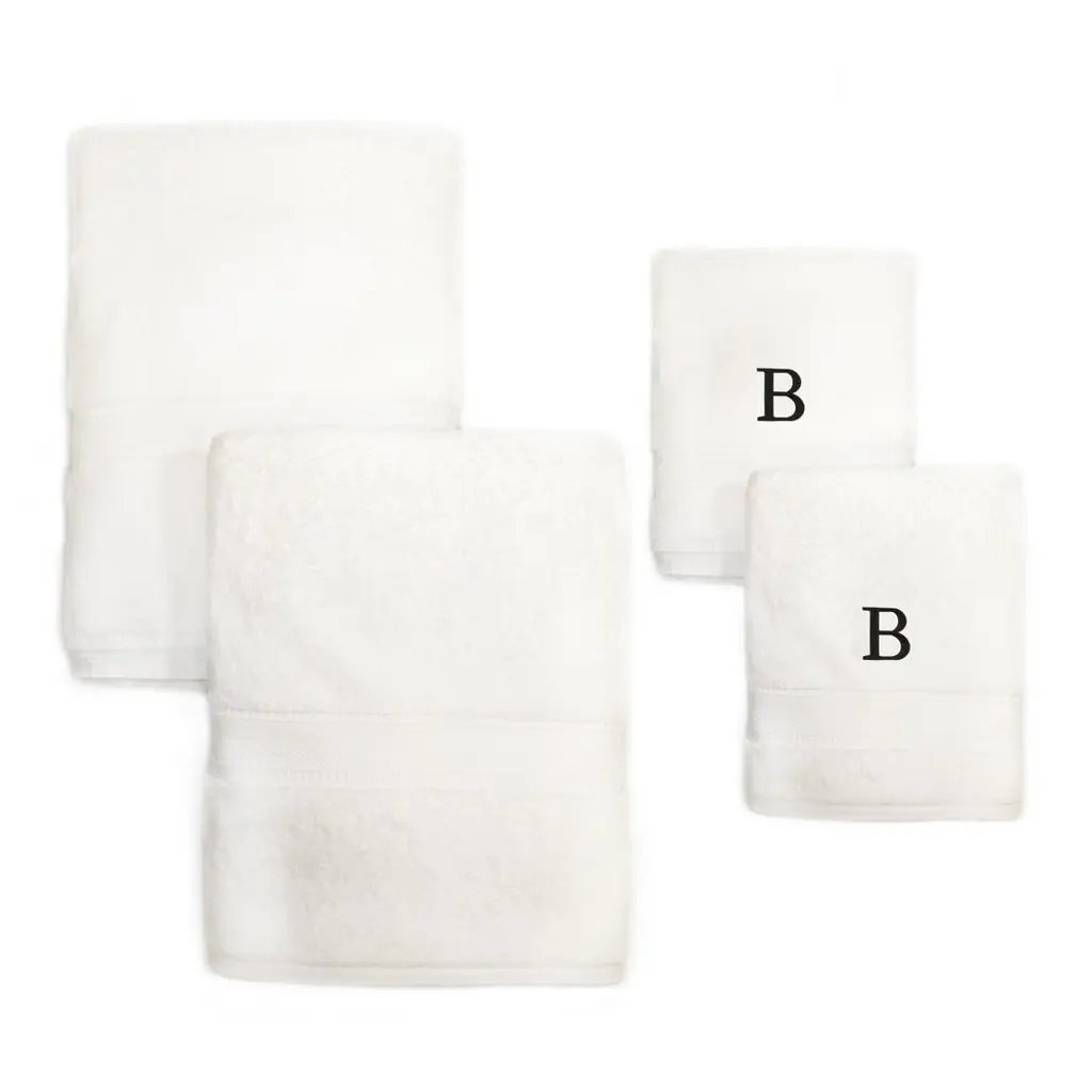 Authentic plush hotel and spa towels are made from high end Turkish cotton with a beautiful embroidered black block initial of your choice monogrammed on each hand towel. These 700 gram Turkish cotton bath towels are made for 5-Star luxury hotels and spas and become softer and more absorbent with every wash.Soft, thick and very absorbentThese long lasting towels are designed for heavy use and become softer with each washWill not pill or shedSet includes: Two (2) monogrammed hand towel, two (2) plain white bath towelsPattern: White embroidered with the initial of your choice in black block on the hand towels onlyType of cotton: TurkishConstruction: Looped terryclothMaterials: 100 percent Turkish cottonCare instructions: Machine washableMade in TurkeyHand towel: 16 inches wide x 30 inches longBath towel: 27 inches wide x 54 inches longThe digital images we display have the most accurate color possible. However, due to differences in computer monitors, we cannot be responsible for variations in color between the actual product and your screen.Product Features: MonogrammedMaterial: Turkish CottonPattern: Embroidered, Solid ColorSet Include: 4 PieceCare Instruction: Machine WashTowel: Hand Towels, Guest Towels, Bath Towels, Towel SetsColor: White, Black