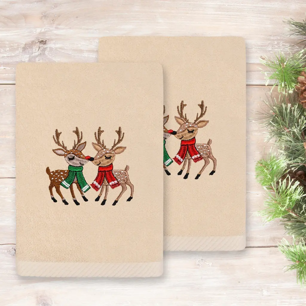 Bring a whimsical Christmas spirit to your decorations with adorable embroidered hand towels by Authentic Hotel and Spa for your guest bath. These "Christmas Kisses" towels feature two cute applique deer exchanging holiday kisses. This special & luxurious Christmas towel is manufactured with more cotton per square inch for maximum softness and absorbency. The Christmas Kisses towels will add a romantic mood to your festivities and make a great gift!Embroidered Christmas Kisses Design100% Genuine Turkish CottonMachine wash cold, no bleach, line dry or dry cleanAvailable in color options white or sandSet includes 2 embroidered hand towels (16" x 30")Made in TurkeyProudly Embellished in USA