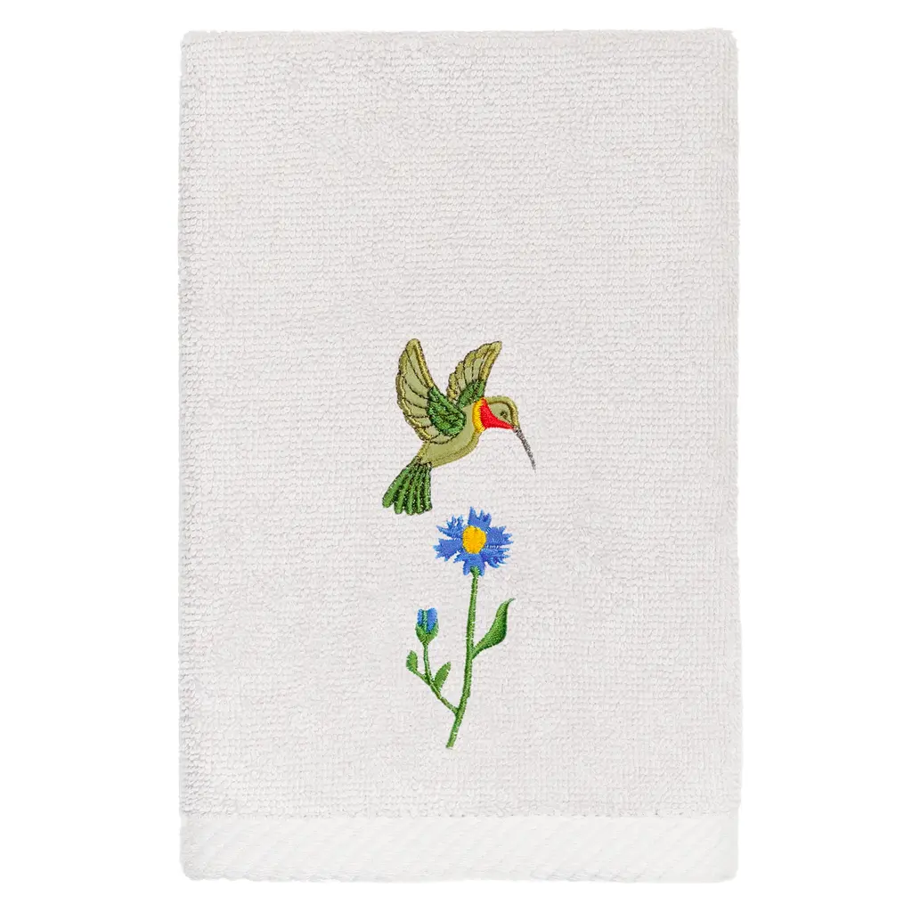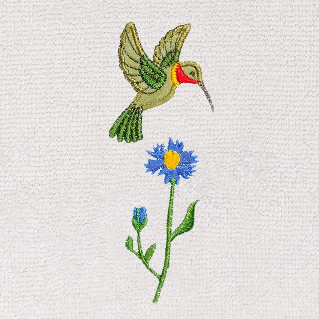 Your bath decor is not complete without delightful embroidered towels by Authentic Hotel and Spa for the comfort of your family and guests. The Hada towels feature applique hummingbirds, dancing among wild flowers and are trimmed with a lustrous taffeta border. Cloud soft and super absorbent, these luxurious, durable towels keep their plush appearance after washing. This collection is available in 8 elegant colors: White, Beige, Blush, Aqua, Silver, Cocoa, Charcoal and Marine. The Hada Towel Collection brings cheerful spirit and richness to your home decor and makes a great gift. Note: Due to variations in computer screen resolutions, slight color differences may exist between images provided and actual product.Embroidered Hummingbird and Flower design100% Premium Turkish CottonSuperbly absorbent and quick dryingAvailable in 8 elegant colorsMachine wash cold, No bleach, line dry or dry cleanSet includes 2 fingertip towels (11" x 18")Made in TurkeyProudly Embellished in USA