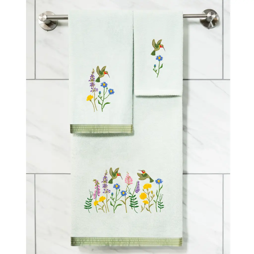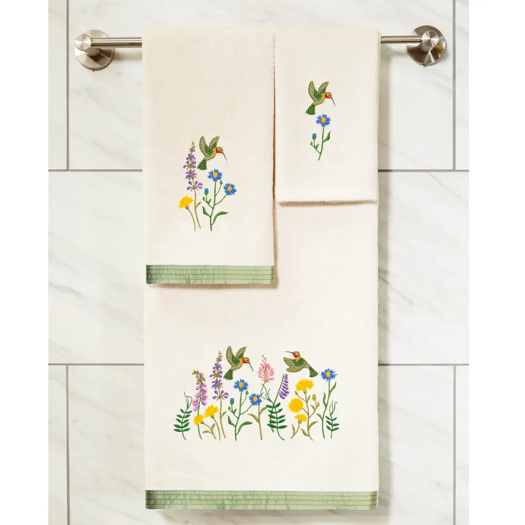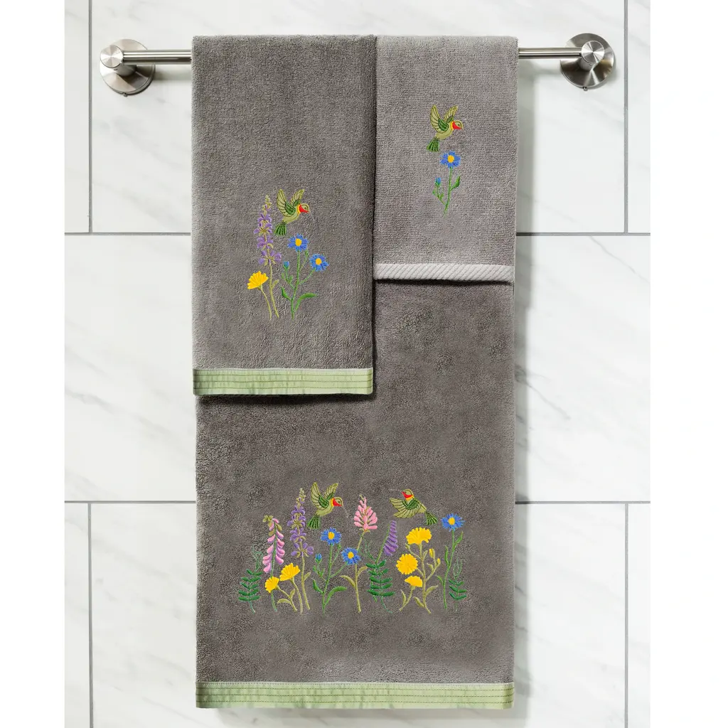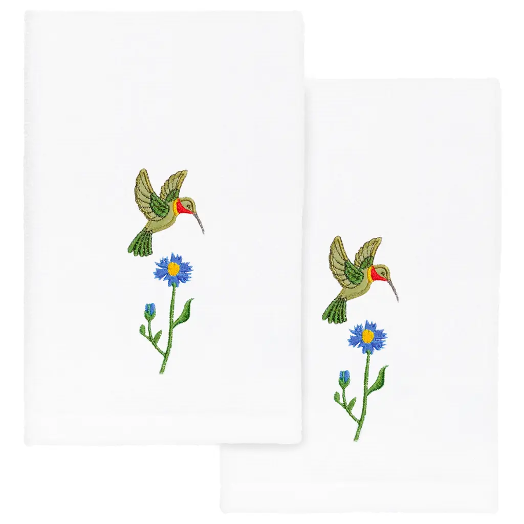 Your bath decor is not complete without delightful embroidered towels by Authentic Hotel and Spa for the comfort of your family and guests. The Hada towels feature applique hummingbirds, dancing among wild flowers and are trimmed with a lustrous taffeta border. Cloud soft and super absorbent, these luxurious, durable towels keep their plush appearance after washing. This collection is available in 8 elegant colors: White, Beige, Blush, Aqua, Silver, Cocoa, Charcoal and Marine. The Hada Towel Collection brings cheerful spirit and richness to your home decor and makes a great gift. Note: Due to variations in computer screen resolutions, slight color differences may exist between images provided and actual product.Embroidered Hummingbird and Flower design100% Premium Turkish CottonSuperbly absorbent and quick dryingAvailable in 8 elegant colorsMachine wash cold, No bleach, line dry or dry cleanSet includes 2 fingertip towels (11" x 18")Made in TurkeyProudly Embellished in USA