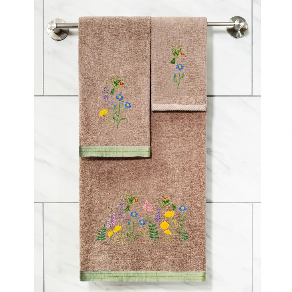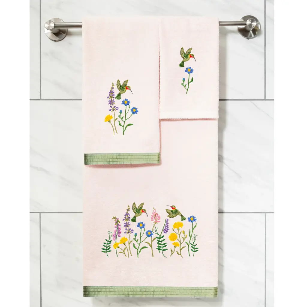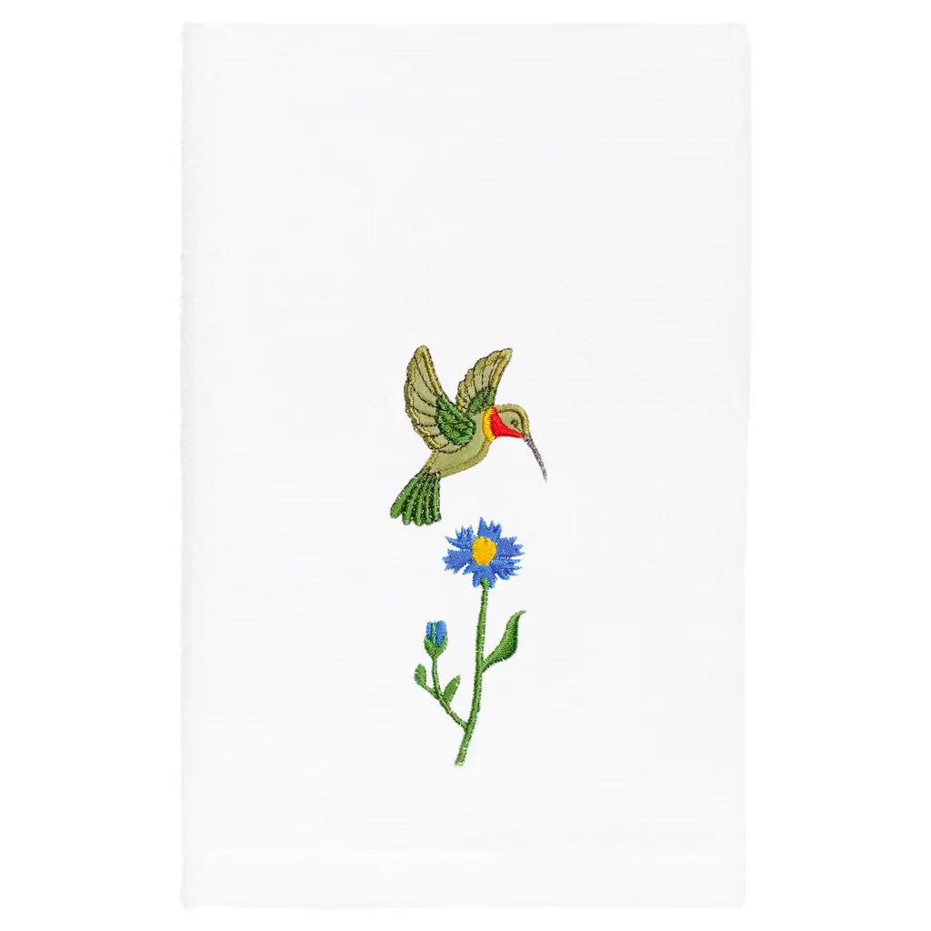Your bath decor is not complete without delightful embroidered towels by Authentic Hotel and Spa for the comfort of your family and guests. The Hada towels feature applique hummingbirds, dancing among wild flowers and are trimmed with a lustrous taffeta border. Cloud soft and super absorbent, these luxurious, durable towels keep their plush appearance after washing. This collection is available in 8 elegant colors: White, Beige, Blush, Aqua, Silver, Cocoa, Charcoal and Marine. The Hada Towel Collection brings cheerful spirit and richness to your home decor and makes a great gift. Note: Due to variations in computer screen resolutions, slight color differences may exist between images provided and actual product.Embroidered Hummingbird and Flower design100% Premium Turkish CottonSuperbly absorbent and quick dryingAvailable in 8 elegant colorsMachine wash cold, No bleach, line dry or dry cleanSet includes 2 fingertip towels (11" x 18")Made in TurkeyProudly Embellished in USA