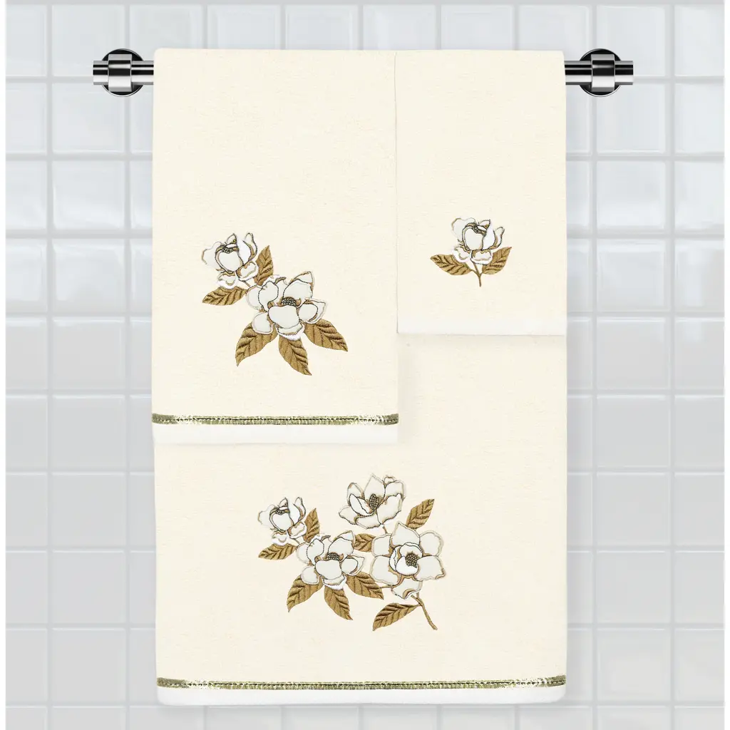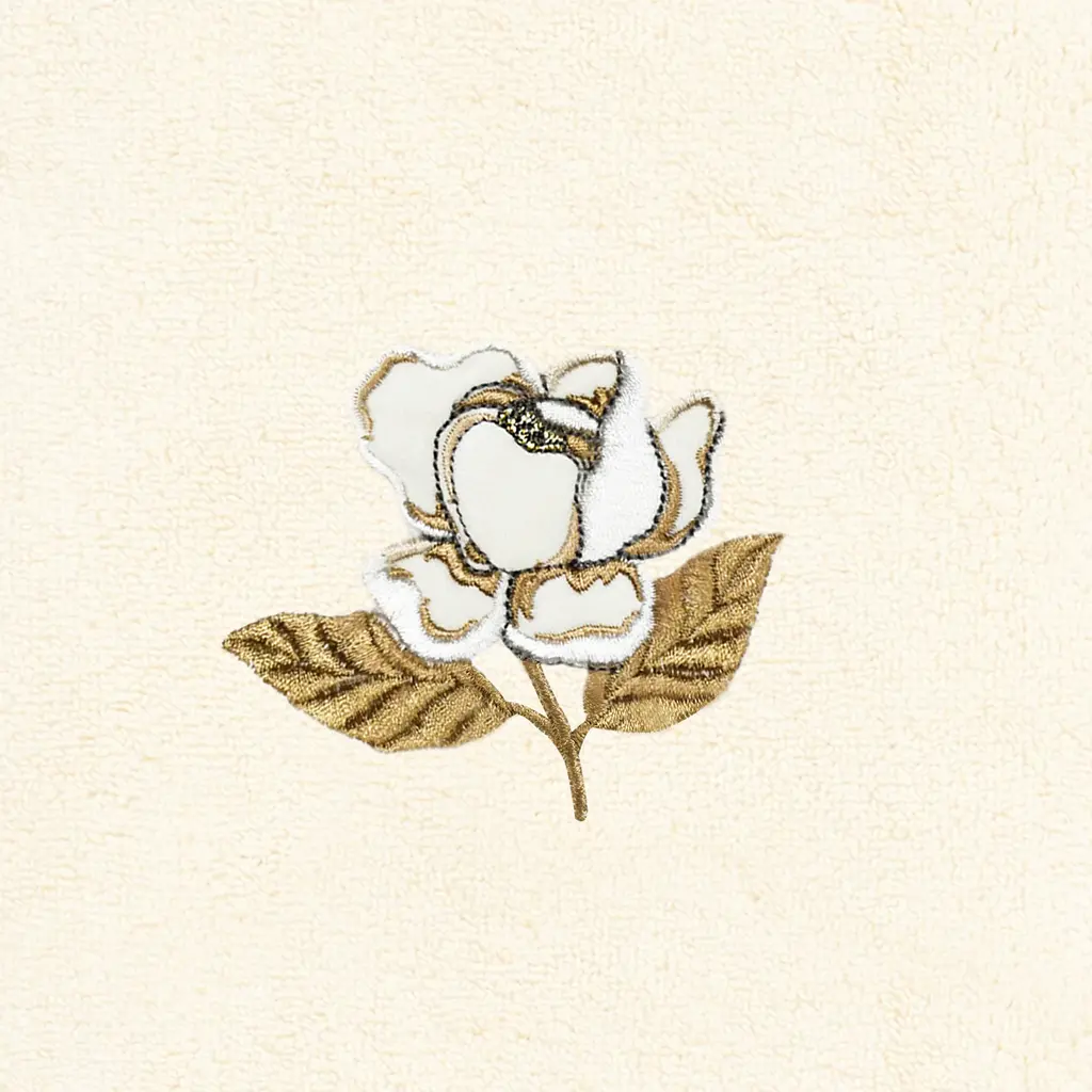 Your decorations are not complete without exquisite embroidered towels for the comfort of your family and guests. The MAGGIE towels feature a branch of lustrous applique magnolia blossoms and are trimmed with a metallic lame cord. Cloud soft and super absorbent, these luxurious, durable towels keep their plush appearance after washing. This collection is available in 8 elegant colors: White, Beige, Blush, Aqua, Silver, Cocoa, Charcoal and Marine. The MAGGIE Towel Collection brings classic spirit and richness to your home decor and makes a great gift!