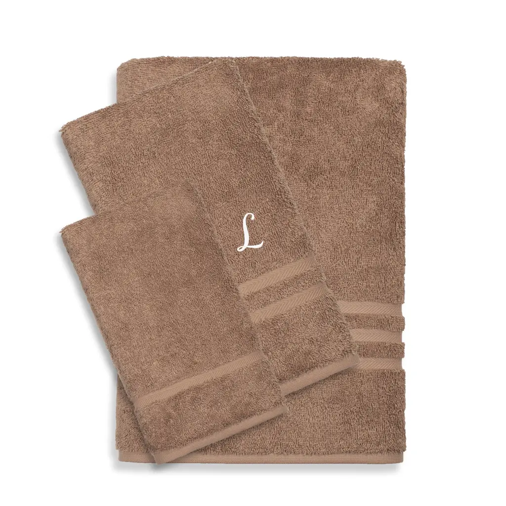 Authentic Hotel And Spa Omni Turkish Cotton Terry 3-Piece Brown Bath Towel Set With Monogrammed Initial Hand Towel - Latte/white Y