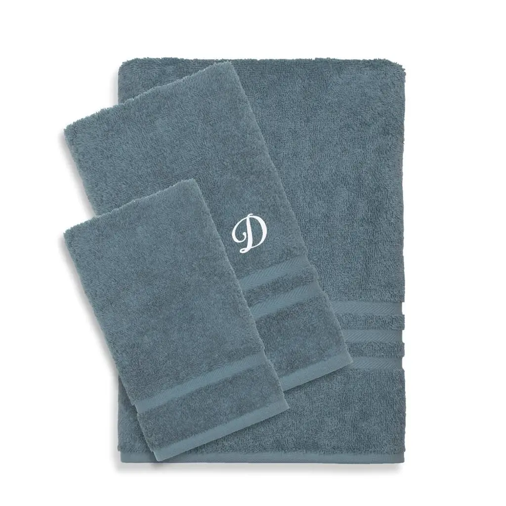 Give your bathroom a personalized slant with this set of towels featuring your choice of initial. These towels dry you off quickly thanks to Turkish cotton terry construction.3 piece set includes 1 bath towel, 1 hand towel and 1 washclothSoft, thick and very absorbentLong-lasting towels designed for heavy useBecome softer with each washWill not pill or shedPattern: Medium blue solid terry with an embroidered white script initial of your choiceMaterials: 100 percent Turkish cottonCare instructions: Machine washableMade in TurkeyBath Towel: 27 inches wide x 54 inches longHand Towel: 16 inches wide x 30 inches longWashcloth: 13 inches wide x 13 inches longSet Includes: 3 PieceProduct Features: Monogrammed, Eco-FriendlyMaterial: Turkish CottonPattern: Solid Color, EmbroideredCare Instruction: Machine WashTowel: Bath Towels, Towel Sets, DecorativeColor: White, Blue