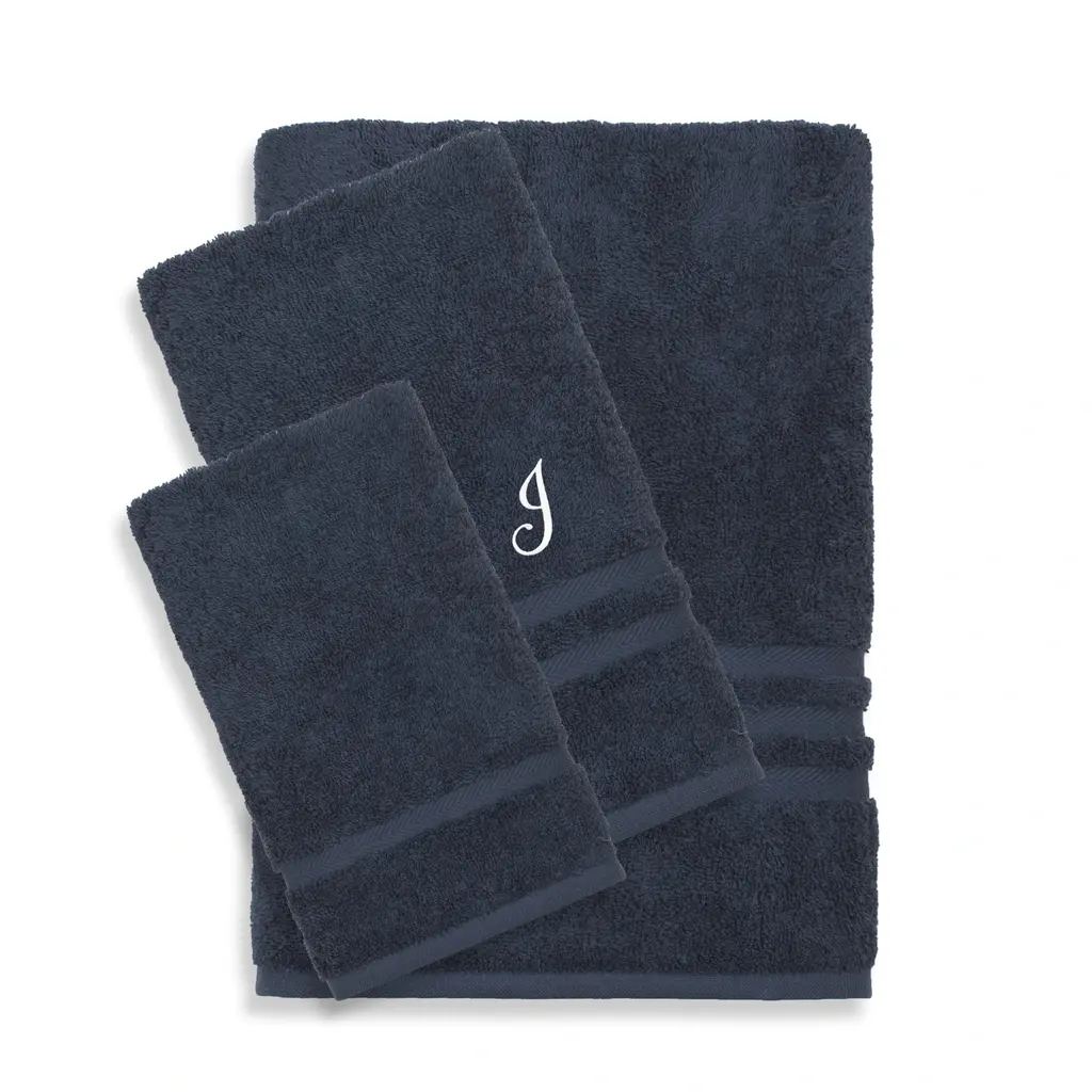 Authentic Hotel And Spa Omni Turkish Cotton Terry 3-Piece Navy Blue Bath Towel Set With White Script Monogrammed Initial - C