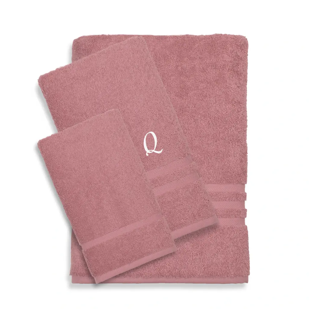 Dry off in comfort and luxury with this three-piece bath towel set. This set features 100-percent Turkish cotton for soft absorbency. The luxurious 3-piece set includes 1 bath towel, 1 hand towel, and 1 washcloth in tea rose. The hand towel is embroidered with a white script initial monogram of your choice which will add simple elegance to your bathroom.Details:3 piece set includes 1 bath towel, 1 hand towel and 1 washclothSoft, thick and very absorbentLong-lasting towels designed for heavy useBecome softer with each washWill not pill or shedMaterials: 100 percent Turkish cottonCare instructions: Machine washableMade in TurkeSet Includes: 3 PieceProduct Features: Monogrammed, Eco-FriendlyPattern: Solid Color, EmbroideredCare Instruction: Machine WashTowel: Bath Towels, Towel Sets, DecorativeColor: White, PinkDimensions:Bath Towel: 27 inches wide x 54 inches longHand Towel: 16 inches wide x 30 inches longWashcloth: 13 inches wide x 13 inches long