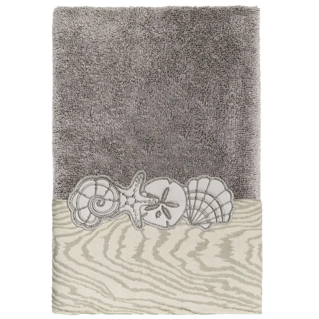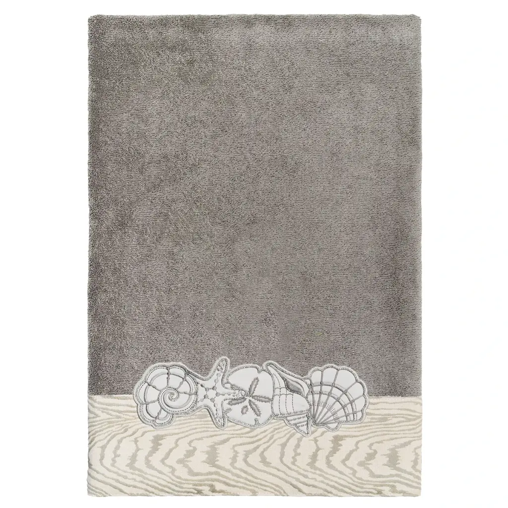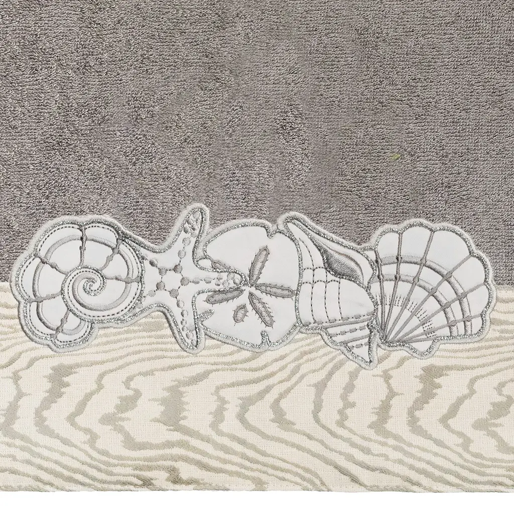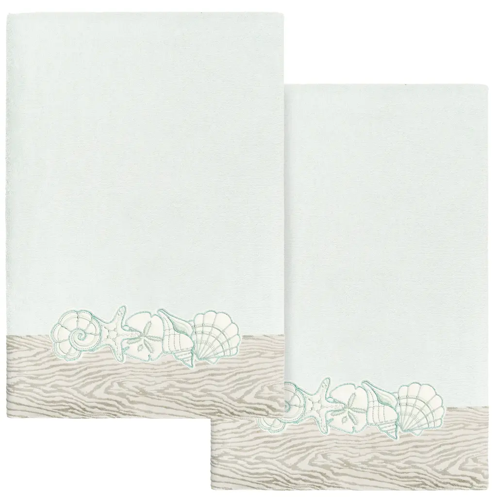 Your bath decor is not complete without a set of beautiful embroidered towels by Authentic Hotel and Spa for the comfort of your family and guests. The Shell Row towels feature sparkling applique seashells on a weathered woodgrain pattern jacquard border. Cloud soft and super absorbent, these luxurious, durable towels keep their plush appearance after washing. This collection is available in 8 elegant colors: White, Beige, Blush, Aqua, Silver, Cocoa, Charcoal and Marine. The Shell Row Towel Collection brings seaside spirit and richness to your home decor and makes a great gift. Note: Due to variations in computer screen resolutions, slight color differences may exist between images provided and actual product.Embroidered Seashell design100% Premium Turkish CottonSuperbly absorbent and quick dryingAvailable in 8 elegant colorsMachine wash cold, No bleach, line dry or dry cleanSSet includes 2 bath towels (27" x 54") / 2 hand towels (16" x 30")Made in TurkeyProudly Embellished in USA