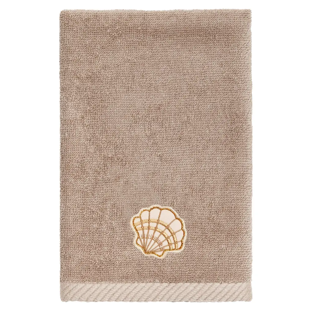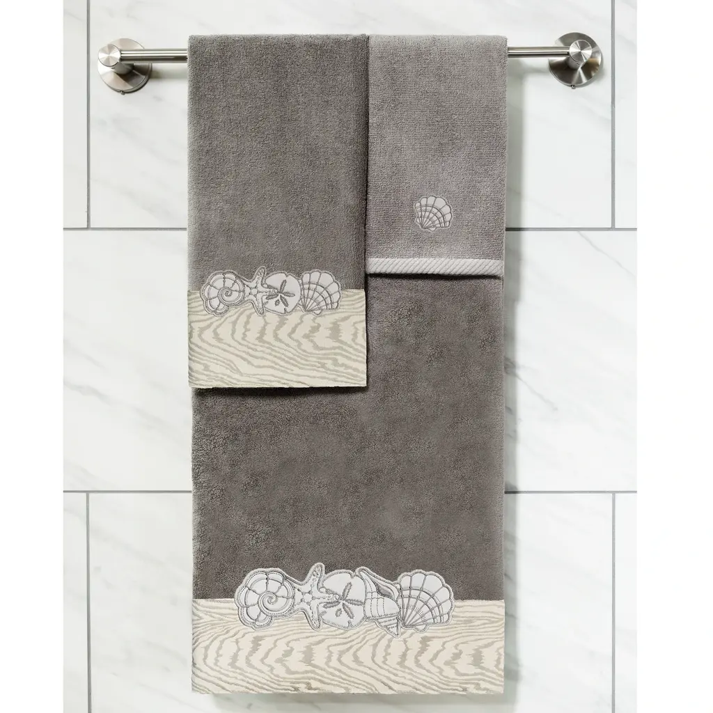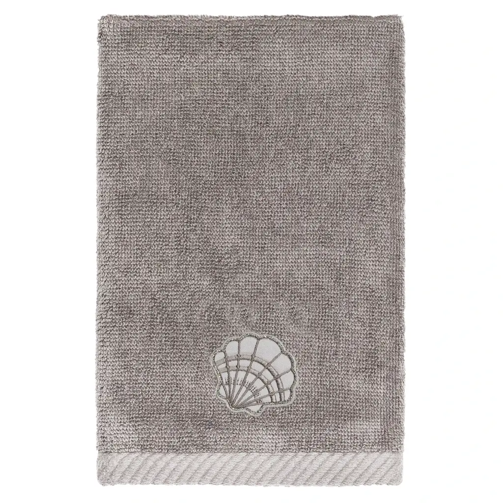 Your bath decor is not complete without lovely embroidered towels by Authentic Hotel and Spa for the comfort of your family and guests. The Shell Row towels feature sparkling applique seashells on a weathered woodgrain pattern jacquard border. Cloud soft and super absorbent, these luxurious, durable towels keep their plush appearance after washing. This collection is available in 8 elegant colors: White, Beige, Blush, Aqua, Silver, Cocoa, Charcoal and Marine. The Shell Row Towel Collection brings seaside spirit and richness to your home decor and makes a great gift. Note: Due to variations in computer screen resolutions, slight color differences may exist between images provided and actual product.Embroidered Seashell design100% Premium Turkish CottonSuperbly absorbent and quick dryingAvailable in 8 elegant colorsMachine wash cold, No bleach, line dry or dry cleanSet includes 2 fingertip towels (11" x 18")Made in TurkeyProudly Embellished in USA