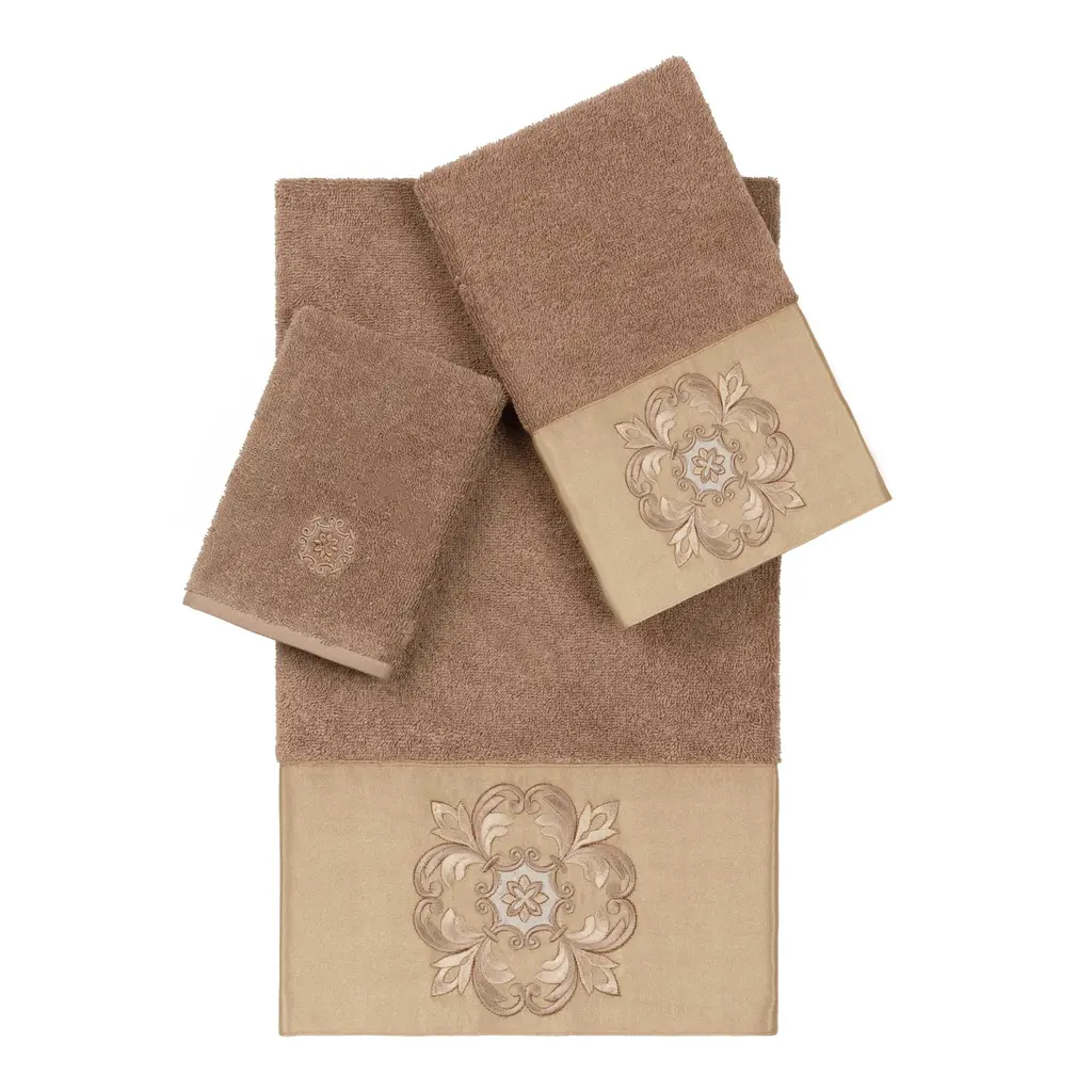 The Alyssa Embellished Towel Collection features a graceful tone on tone medallion motif embroidered on a lustrous bengaline border. These soft and luxurious towels are made of 100% premium Turkish Cotton and offer lasting absorbency and superior durability. 100% Premium Turkish Cotton Superbly absorbent and quick drying Available in a range of lovely towel colors Machine wash cold, No bleach, line dry or dry clean Set includes 1 bath towel (27" x 54") / 1 hand towel (16" x 30") / 1 washcloth (13" x 13") Made in Turkey