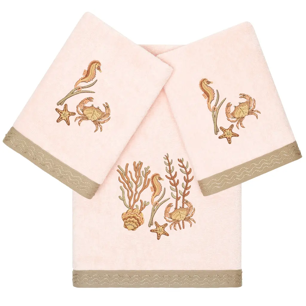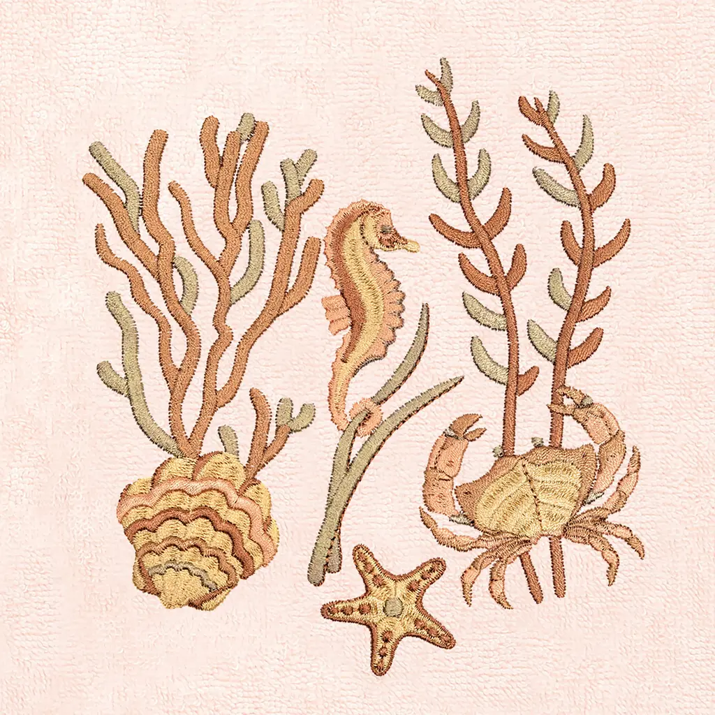 Your decorations are not complete without lively embroidered towels by Authentic Hotel and Spa for the comfort of your family and guests. The Aaron towels feature colorful sea life and are trimmed with an embroidered canvas border. Cloud soft and super absorbent, these luxurious, durable towels keep their plush appearance after washing. This collection is available in 8 elegant colors: White, Beige, Blush, Aqua, Silver, Cocoa, Charcoal and Marine. The Aaron Towel Collection brings coastal spirit and richness to your home decor and makes a great gift! Note: Due to variations in computer screen resolutions, slight color differences may exist between images provided and actual product.Embroidered Sea Life design100% Premium Turkish CottonSuperbly absorbent and quick dryingAvailable in 8 elegant colorsMachine wash cold, No bleach, line dry or dry cleanSet includes 2 bath towels (27" x 54")Made in TurkeyProudly Embellished in USA