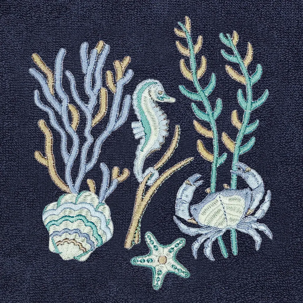 Your decorations are not complete without lively embroidered towels by Authentic Hotel and Spa for the comfort of your family and guests. The Aaron towels feature colorful sea life and are trimmed with an embroidered canvas border. Cloud soft and super absorbent, these luxurious, durable towels keep their plush appearance after washing. This collection is available in 8 elegant colors: White, Beige, Blush, Aqua, Silver, Cocoa, Charcoal and Marine. The Aaron Towel Collection brings coastal spirit and richness to your home decor and makes a great gift! Note: Due to variations in computer screen resolutions, slight color differences may exist between images provided and actual product.Embroidered Sea Life design100% Premium Turkish CottonSuperbly absorbent and quick dryingAvailable in 8 elegant colorsMachine wash cold, No bleach, line dry or dry cleanSet includes 2 bath towels (27" x 54")Made in TurkeyProudly Embellished in USA