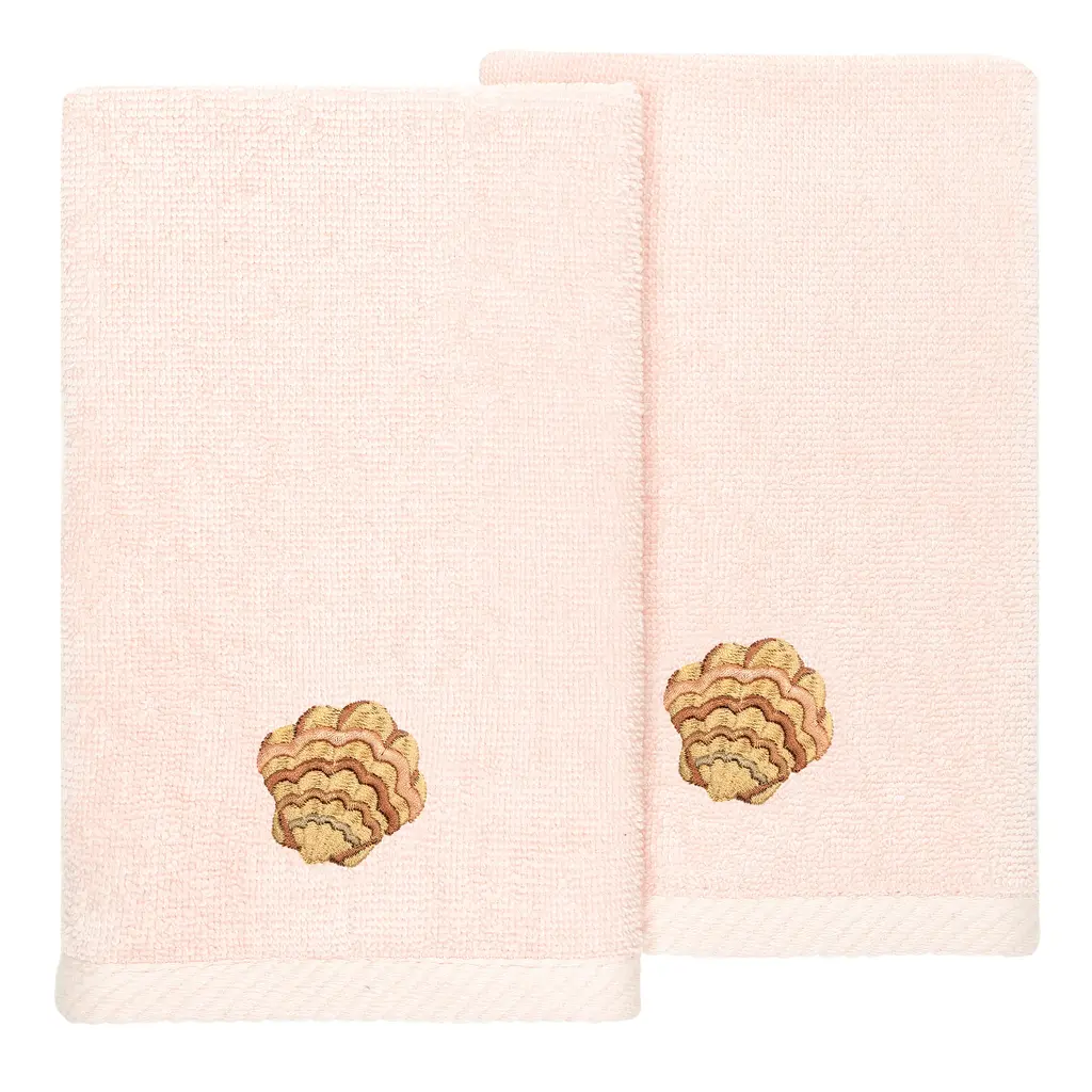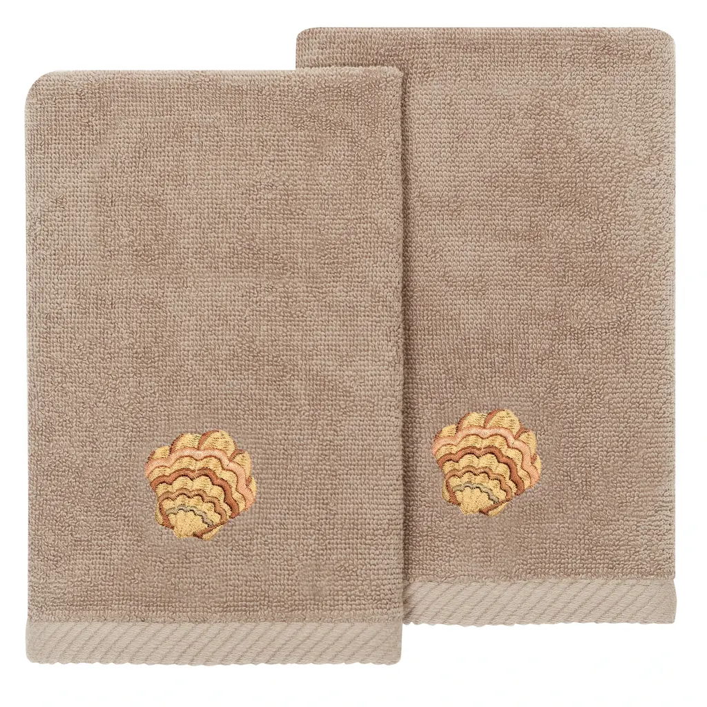 Your decorations are not complete without lively embroidered towels by Authentic Hotel and Spa for the comfort of your family and guests. The Aaron towels feature colorful sea life and are trimmed with an embroidered canvas border. Cloud soft and super absorbent, these luxurious, durable towels keep their plush appearance after washing. This collection is available in 8 elegant colors: White, Beige, Blush, Aqua, Silver, Cocoa, Charcoal and Marine. The Aaron Towel Collection brings coastal spirit and richness to your home decor and makes a great gift! Note: Due to variations in computer screen resolutions, slight color differences may exist between images provided and actual product.Embroidered Sea Life design100% Premium Turkish CottonSuperbly absorbent and quick dryingAvailable in 8 elegant colorsMachine wash cold, No bleach, line dry or dry cleanSet includes 2 fingertip towels (11" x 18")Made in TurkeyProudly Embellished in USA