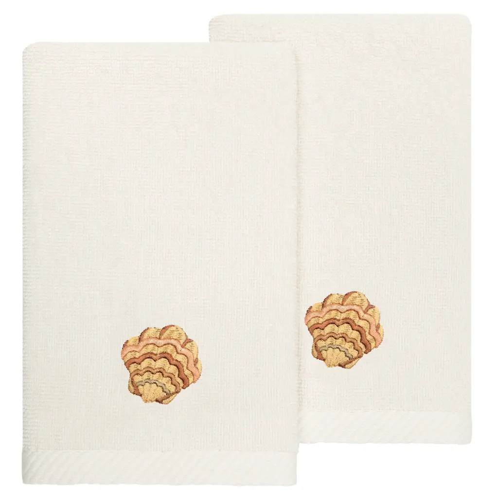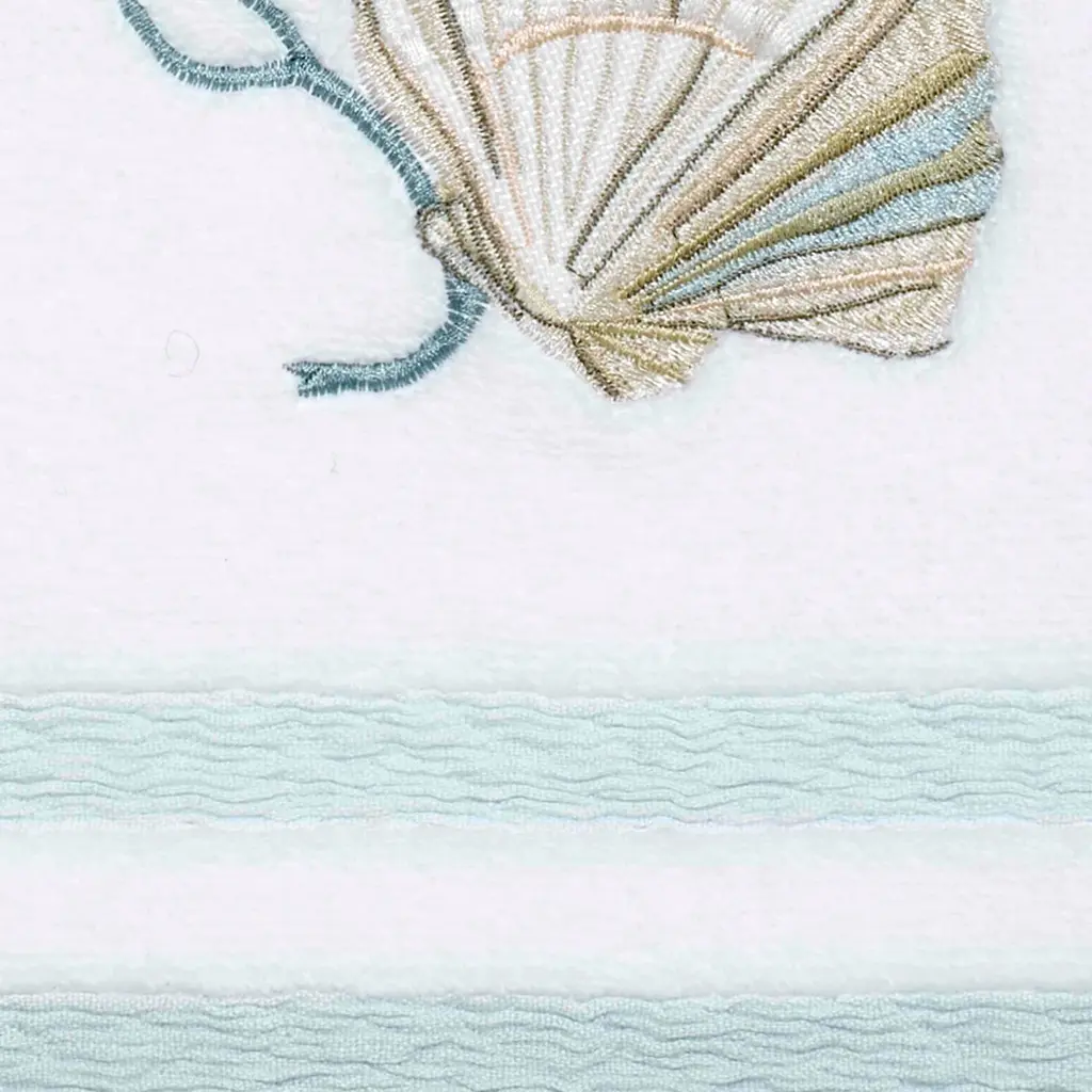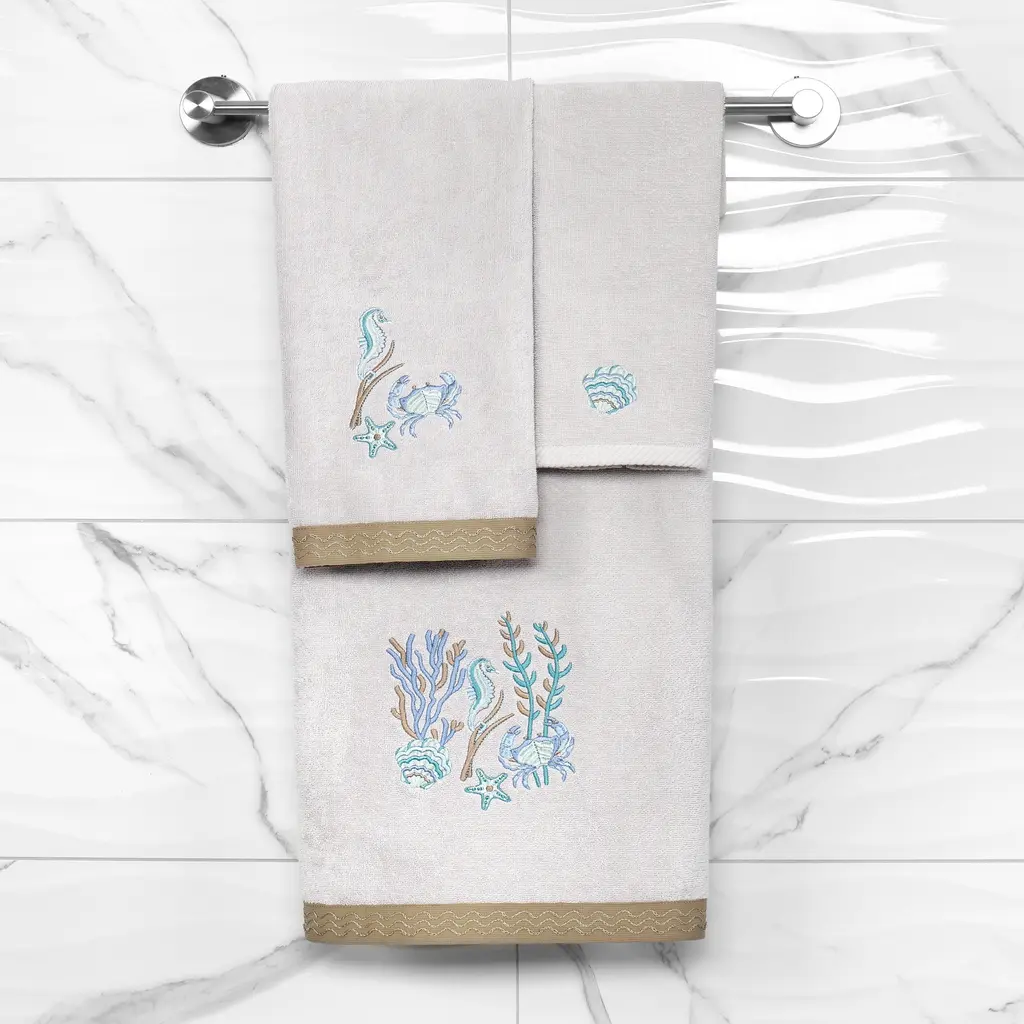 Your decorations are not complete without lively embroidered towels by Authentic Hotel and Spa for the comfort of your family and guests. The Aaron towels feature colorful sea life and are trimmed with an embroidered canvas border. Cloud soft and super absorbent, these luxurious, durable towels keep their plush appearance after washing. This collection is available in 8 elegant colors: White, Beige, Blush, Aqua, Silver, Cocoa, Charcoal and Marine. The Aaron Towel Collection brings coastal spirit and richness to your home decor and makes a great gift! Note: Due to variations in computer screen resolutions, slight color differences may exist between images provided and actual product.Embroidered Sea Life design100% Premium Turkish CottonSuperbly absorbent and quick dryingAvailable in 8 elegant colorsMachine wash cold, No bleach, line dry or dry cleanSet includes 2 fingertip towels (11" x 18")Made in TurkeyProudly Embellished in USA