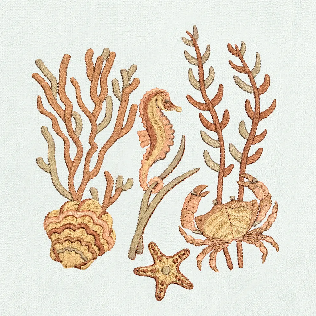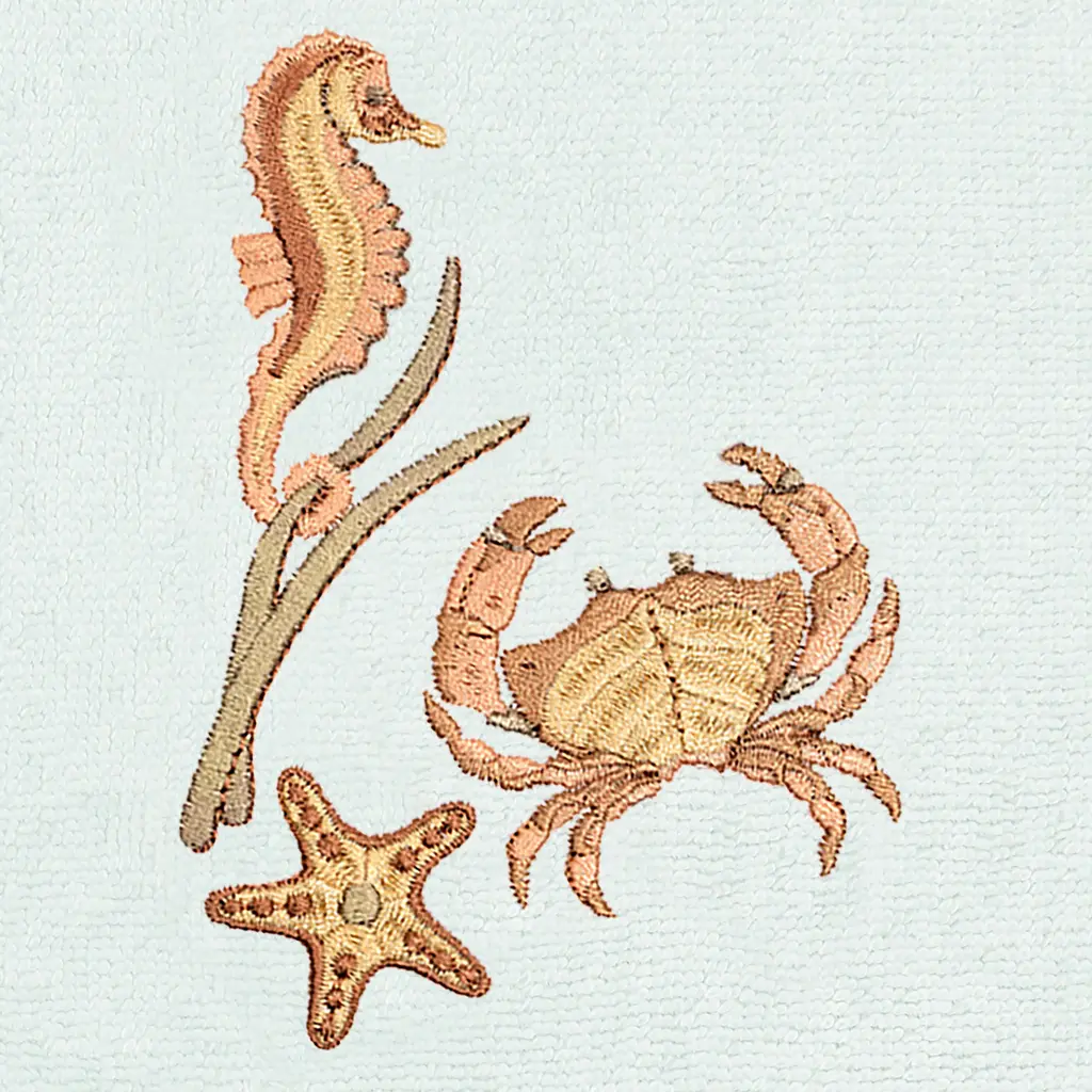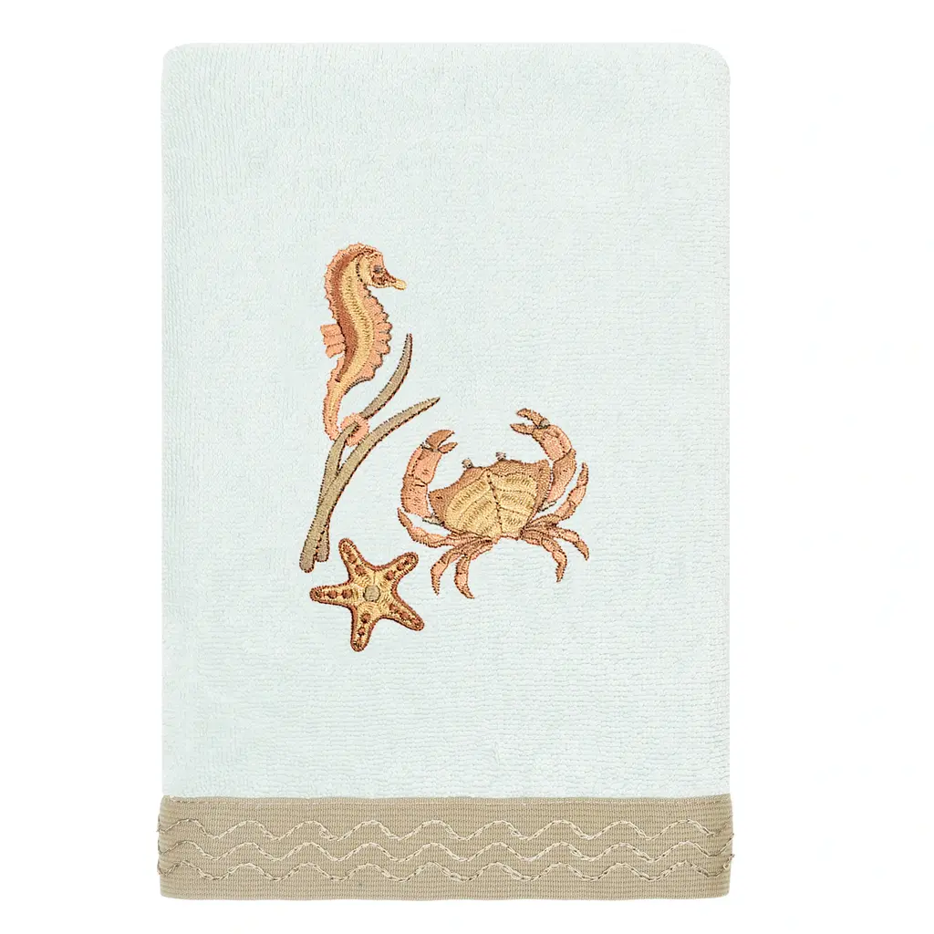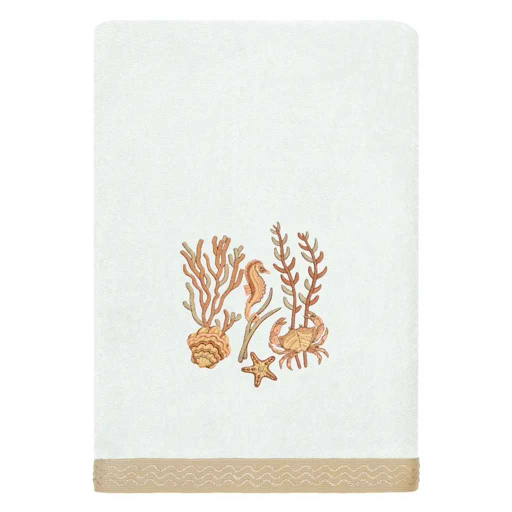 Your decorations are not complete without lively embroidered towels by Authentic Hotel and Spa for the comfort of your family and guests. The Aaron towels feature colorful sea life and are trimmed with an embroidered canvas border. Cloud soft and super absorbent, these luxurious, durable towels keep their plush appearance after washing. This collection is available in 8 elegant colors: White, Beige, Blush, Aqua, Silver, Cocoa, Charcoal and Marine. The Aaron Towel Collection brings coastal spirit and richness to your home decor and makes a great gift! Note: Due to variations in computer screen resolutions, slight color differences may exist between images provided and actual product.Embroidered Sea Life design100% Premium Turkish CottonSuperbly absorbent and quick dryingAvailable in 8 elegant colorsMachine wash cold, No bleach, line dry or dry cleanSet includes 1 bath towel (27" x 54") / 1 hand towel (16" x 30") / 1 fingertip towel (11" x 18")Made in TurkeyProudly Embellished in USA