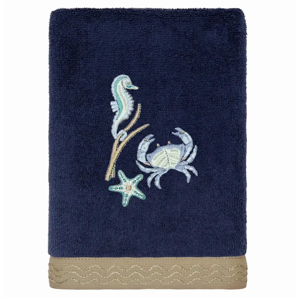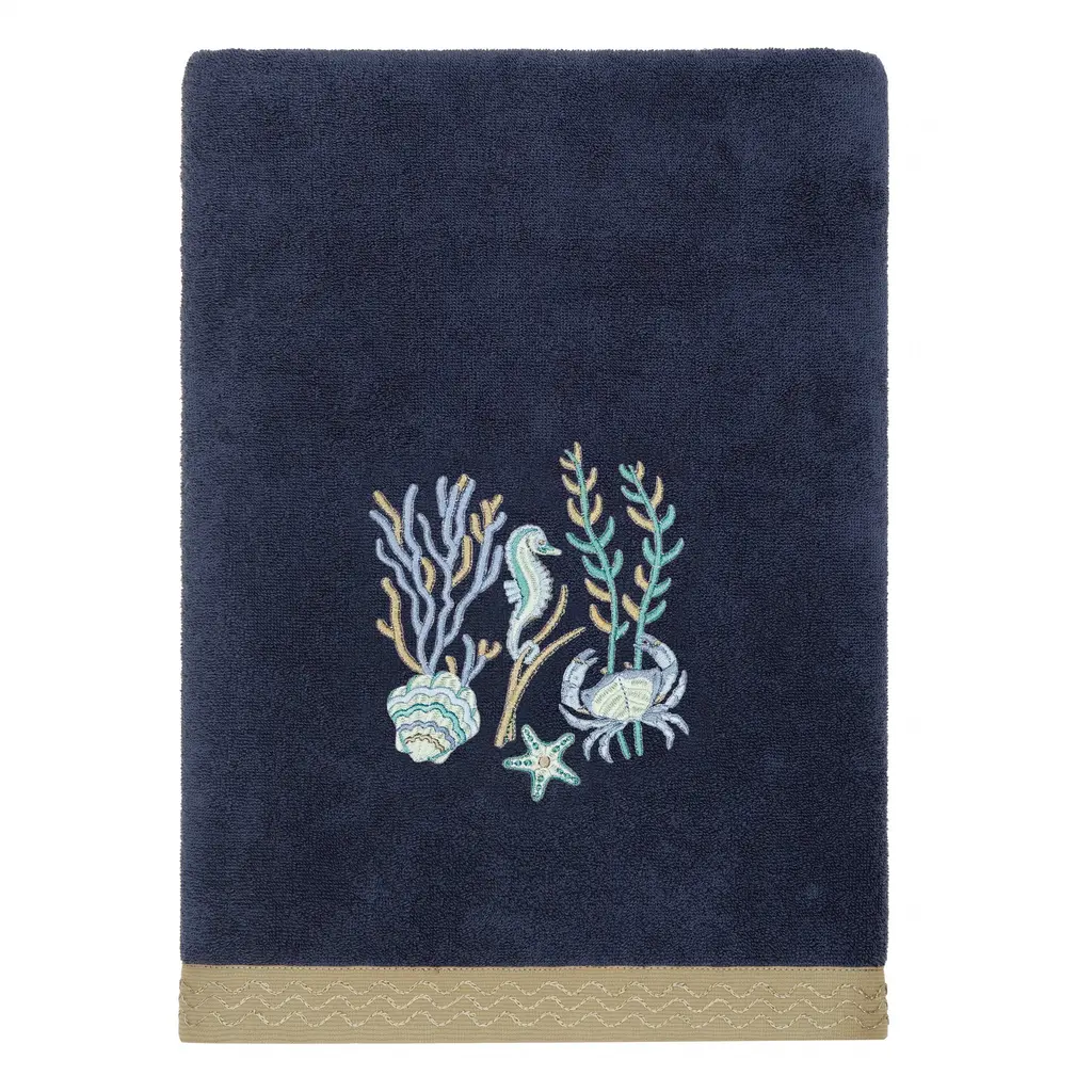Your decorations are not complete without lively embroidered towels by Authentic Hotel and Spa for the comfort of your family and guests. The Aaron towels feature colorful sea life and are trimmed with an embroidered canvas border. Cloud soft and super absorbent, these luxurious, durable towels keep their plush appearance after washing. This collection is available in 8 elegant colors: White, Beige, Blush, Aqua, Silver, Cocoa, Charcoal and Marine. The Aaron Towel Collection brings coastal spirit and richness to your home decor and makes a great gift! Note: Due to variations in computer screen resolutions, slight color differences may exist between images provided and actual product.Embroidered Sea Life design100% Premium Turkish CottonSuperbly absorbent and quick dryingAvailable in 8 elegant colorsMachine wash cold, No bleach, line dry or dry cleanSet includes 1 bath towel (27" x 54") / 1 hand towel (16" x 30") / 1 fingertip towel (11" x 18")Made in TurkeyProudly Embellished in USA