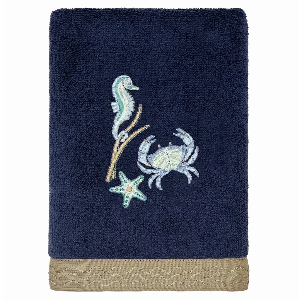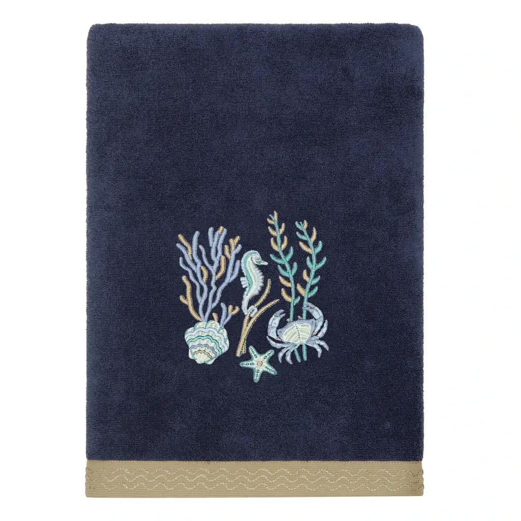 Your decorations are not complete without lively embroidered towels by Authentic Hotel and Spa for the comfort of your family and guests. The Aaron towels feature colorful sea life and are trimmed with an embroidered canvas border. Cloud soft and super absorbent, these luxurious, durable towels keep their plush appearance after washing. This collection is available in 8 elegant colors: White, Beige, Blush, Aqua, Silver, Cocoa, Charcoal and Marine. The Aaron Towel Collection brings coastal spirit and richness to your home decor and makes a great gift! Note: Due to variations in computer screen resolutions, slight color differences may exist between images provided and actual product.Embroidered Sea Life design100% Premium Turkish CottonSuperbly absorbent and quick dryingAvailable in 8 elegant colorsMachine wash cold, No bleach, line dry or dry cleanSet includes 1 bath towel (27" x 54") / 2 hand towels (16" x 30")Made in TurkeyProudly Embellished in USA