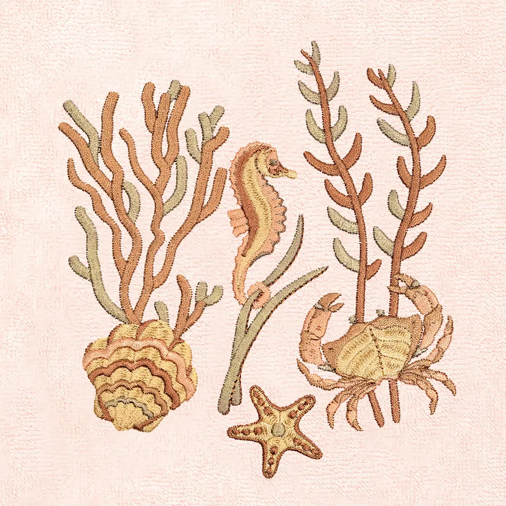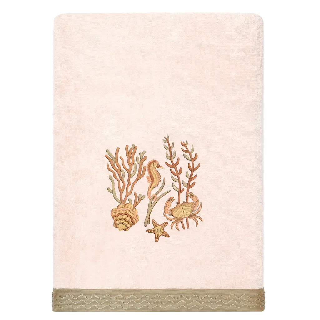 Your decorations are not complete without lively embroidered towels by Authentic Hotel and Spa for the comfort of your family and guests. The Aaron towels feature colorful sea life and are trimmed with an embroidered canvas border. Cloud soft and super absorbent, these luxurious, durable towels keep their plush appearance after washing. This collection is available in 8 elegant colors: White, Beige, Blush, Aqua, Silver, Cocoa, Charcoal and Marine. The Aaron Towel Collection brings coastal spirit and richness to your home decor and makes a great gift! Note: Due to variations in computer screen resolutions, slight color differences may exist between images provided and actual product.Embroidered Sea Life design100% Premium Turkish CottonSuperbly absorbent and quick dryingAvailable in 8 elegant colorsMachine wash cold, No bleach, line dry or dry cleanSet includes 2 bath towels (27" x 54") / 2 hand towels (16" x 30")Proudly Embellished in USA