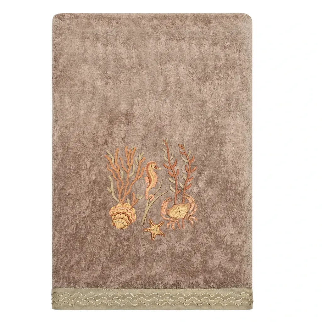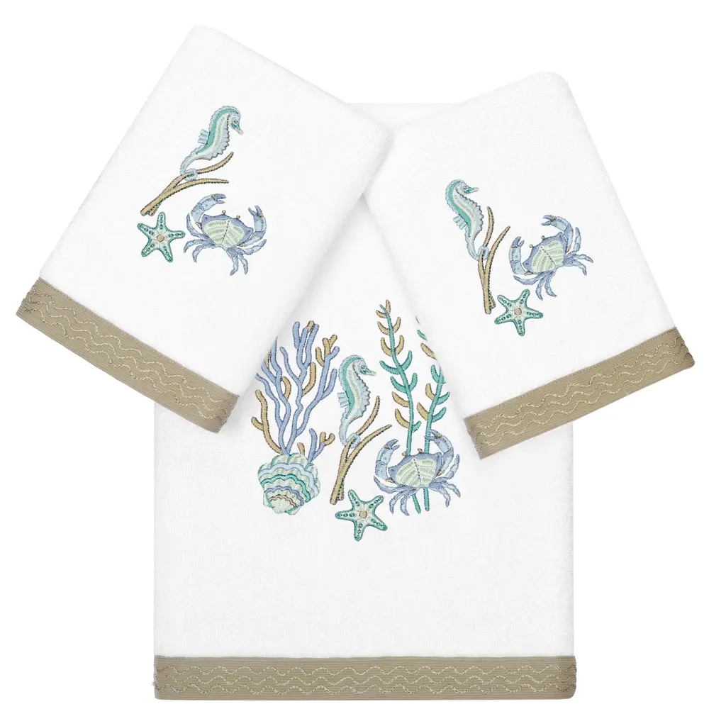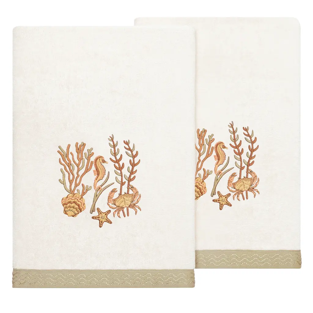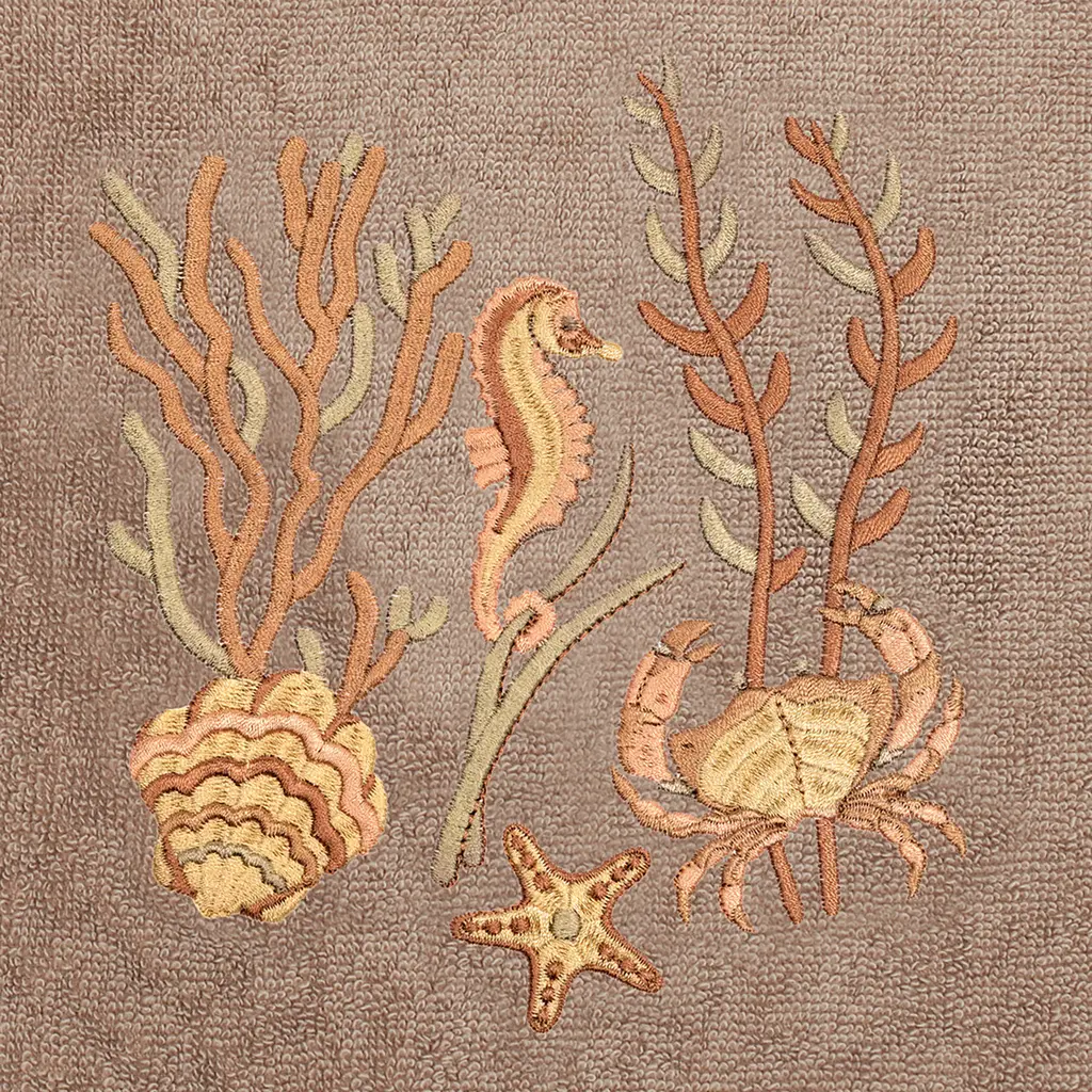 Your decorations are not complete without lively embroidered towels by Authentic Hotel and Spa for the comfort of your family and guests. The Aaron towels feature colorful sea life and are trimmed with an embroidered canvas border. Cloud soft and super absorbent, these luxurious, durable towels keep their plush appearance after washing. This collection is available in 8 elegant colors: White, Beige, Blush, Aqua, Silver, Cocoa, Charcoal and Marine. The Aaron Towel Collection brings coastal spirit and richness to your home decor and makes a great gift! Note: Due to variations in computer screen resolutions, slight color differences may exist between images provided and actual product.Embroidered Sea Life design100% Premium Turkish CottonSuperbly absorbent and quick dryingAvailable in 8 elegant colorsMachine wash cold, No bleach, line dry or dry cleanSet includes 2 bath towels (27" x 54") / 2 hand towels (16" x 30")Proudly Embellished in USA