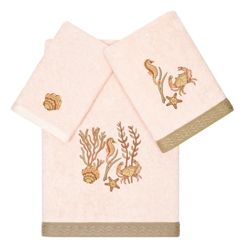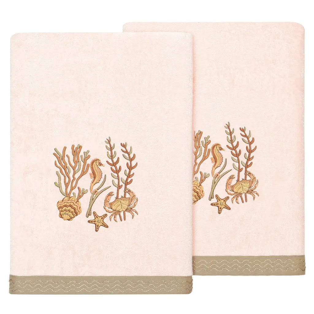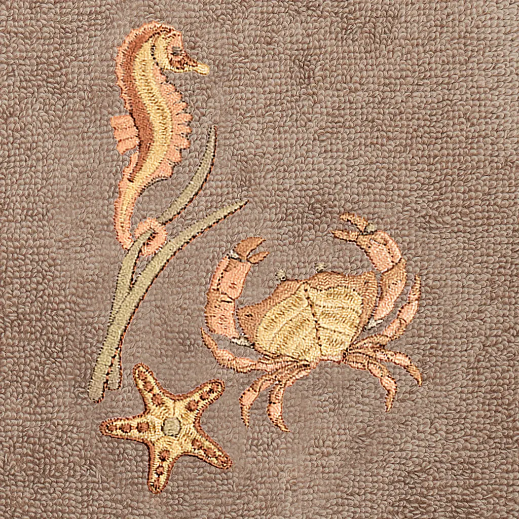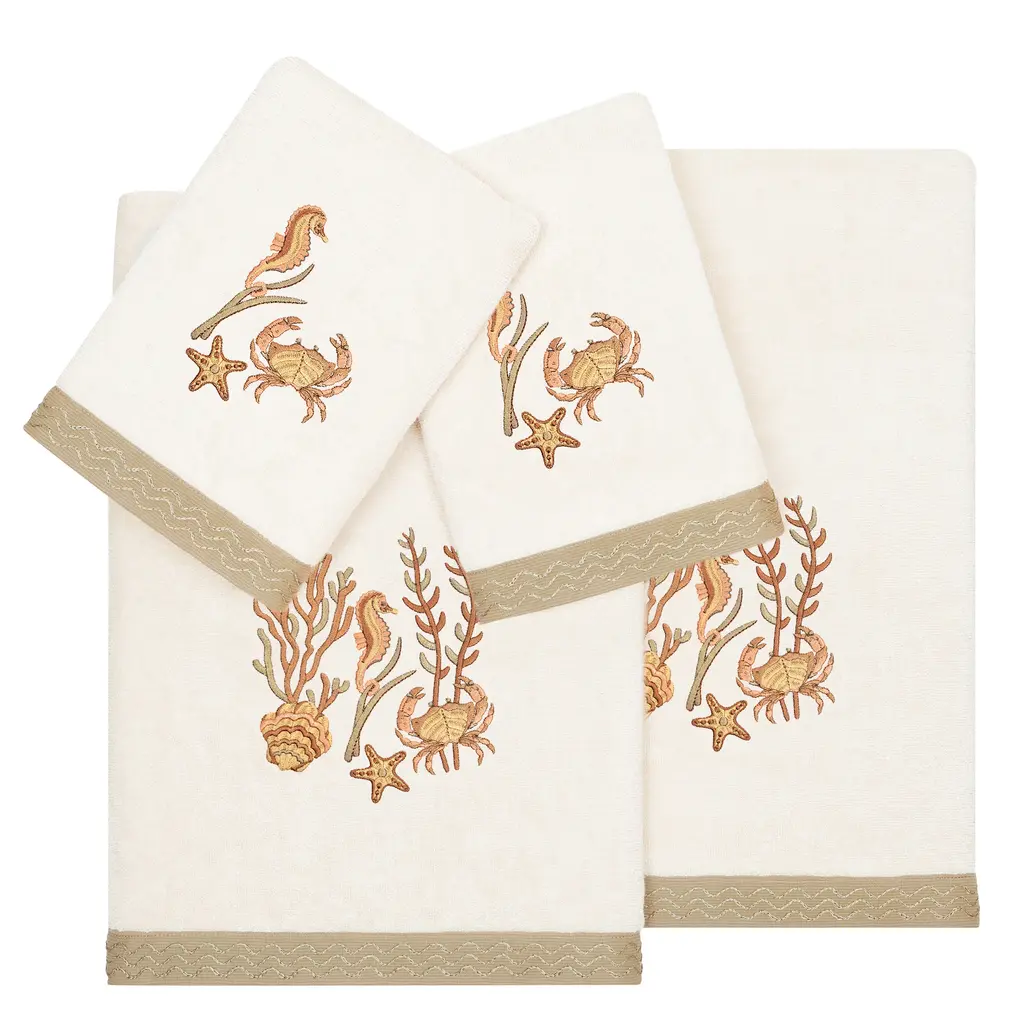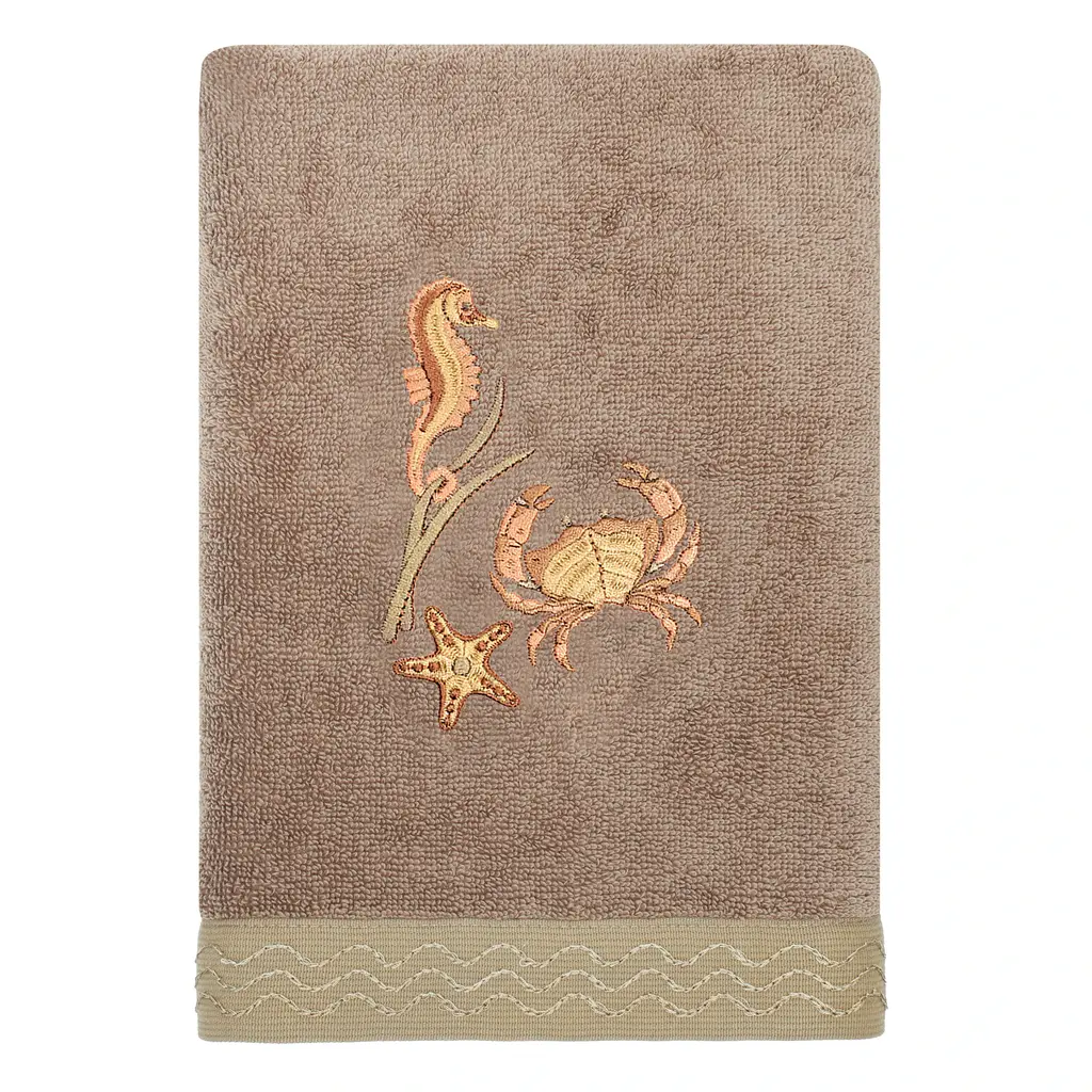 Your decorations are not complete without lively embroidered towels by Authentic Hotel and Spa for the comfort of your family and guests. The Aaron towels feature colorful sea life and are trimmed with an embroidered canvas border. Cloud soft and super absorbent, these luxurious, durable towels keep their plush appearance after washing. This collection is available in 8 elegant colors: White, Beige, Blush, Aqua, Silver, Cocoa, Charcoal and Marine. The Aaron Towel Collection brings coastal spirit and richness to your home decor and makes a great gift! Note: Due to variations in computer screen resolutions, slight color differences may exist between images provided and actual product.Embroidered Sea Life design100% Premium Turkish CottonSuperbly absorbent and quick dryingAvailable in 8 elegant colorsMachine wash cold, No bleach, line dry or dry cleanSet includes 2 bath towels (27" x 54") / 2 hand towels (16" x 30")Proudly Embellished in USA