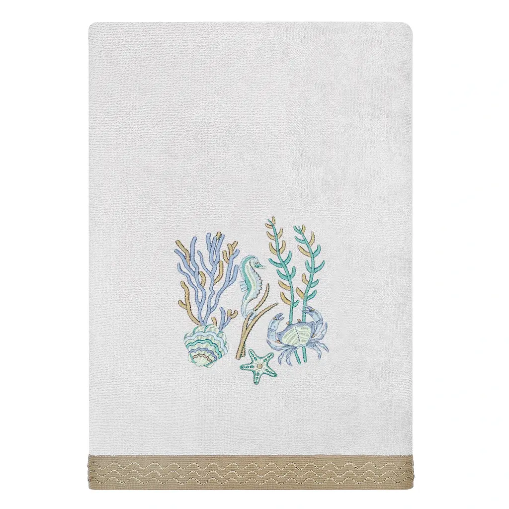 Your decorations are not complete without lively embroidered towels by Authentic Hotel and Spa for the comfort of your family and guests. The Aaron towels feature colorful sea life and are trimmed with an embroidered canvas border. Cloud soft and super absorbent, these luxurious, durable towels keep their plush appearance after washing. This collection is available in 8 elegant colors: White, Beige, Blush, Aqua, Silver, Cocoa, Charcoal and Marine. The Aaron Towel Collection brings coastal spirit and richness to your home decor and makes a great gift! Note: Due to variations in computer screen resolutions, slight color differences may exist between images provided and actual product.Embroidered Sea Life design100% Premium Turkish CottonSuperbly absorbent and quick dryingAvailable in 8 elegant colorsMachine wash cold, No bleach, line dry or dry cleanSet includes 2 bath towels (27" x 54") / 2 hand towels (16" x 30")Proudly Embellished in USA
