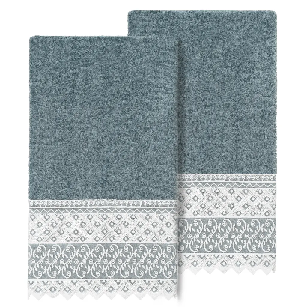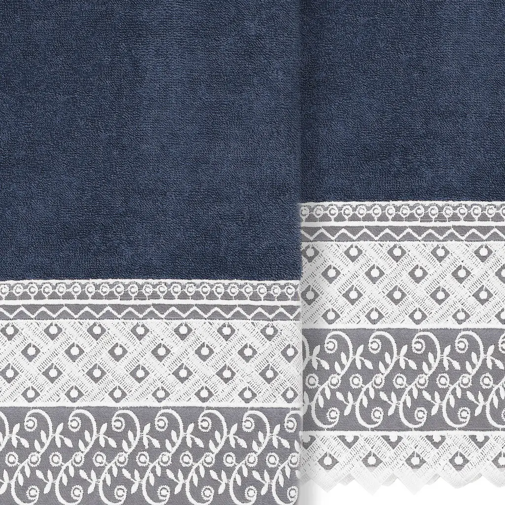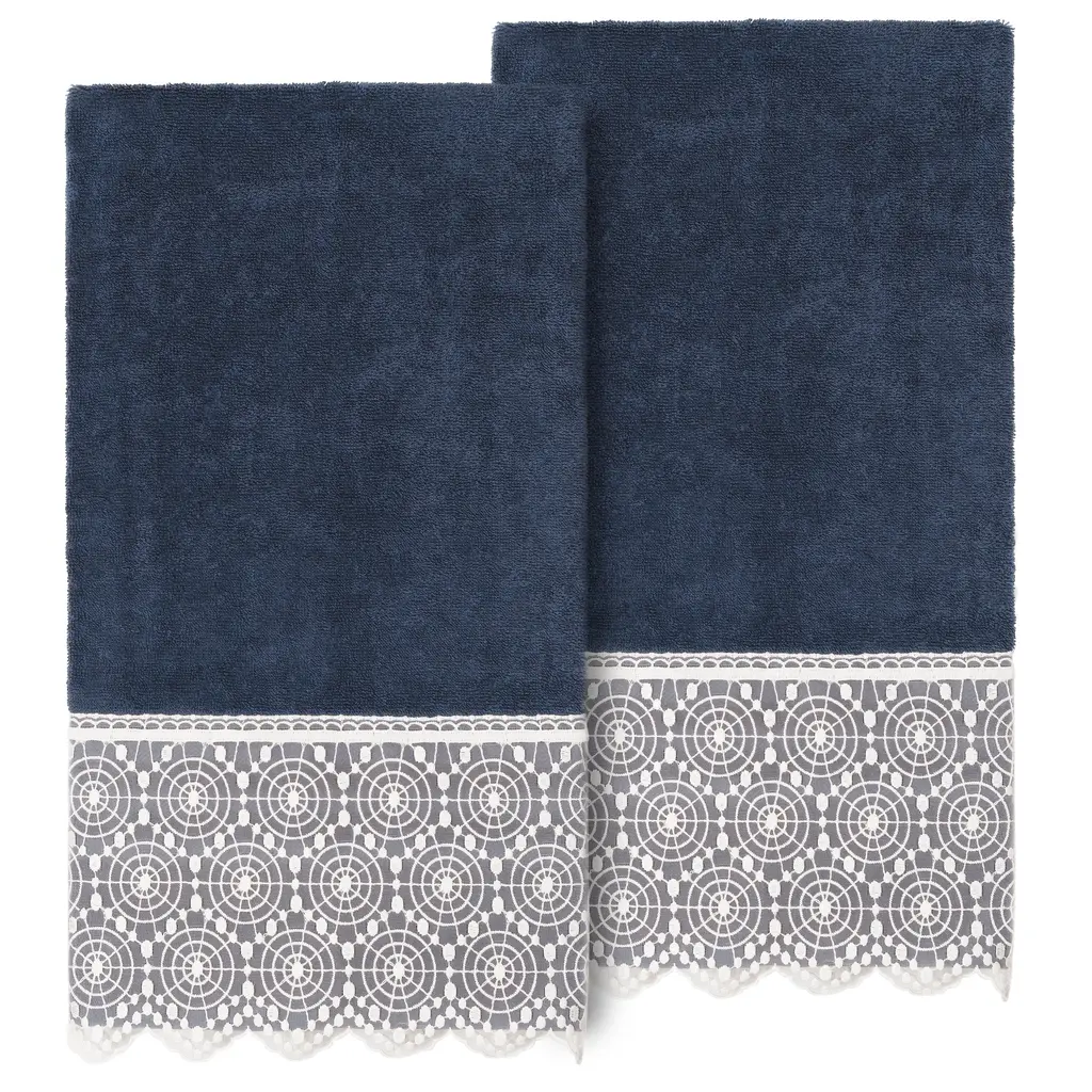 Authentic Hotel And Spa Turkish Cotton Aiden 2Pc White Lace Embellished Bath Towel Set - Navy