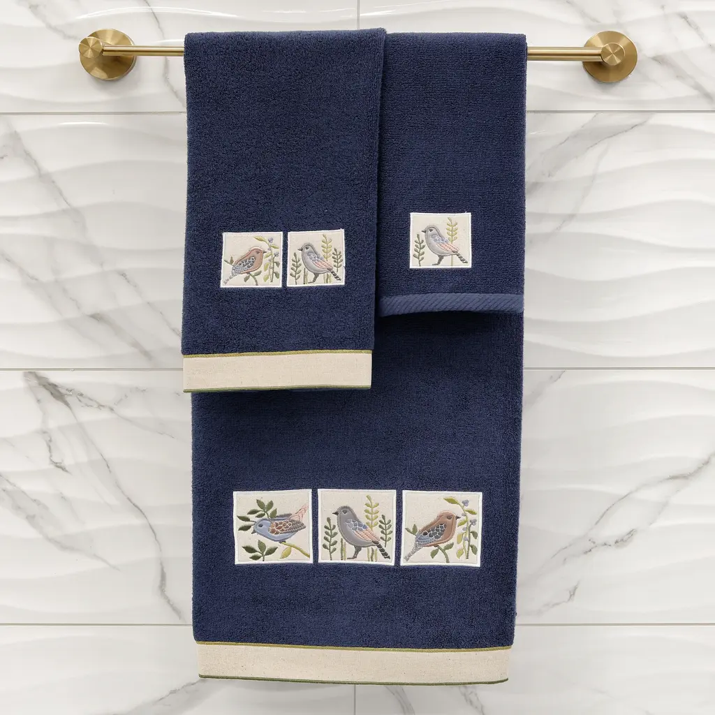 Your decorations are not complete without whimsical embroidered towels for the comfort of your family and guests. The Belinda towels feature charming applique birds and are trimmed with a muslin border. Cloud soft and super absorbent, these luxurious, durable towels keep their plush appearance after washing. This collection is available in 8 elegant colors: White, Beige, Blush, Aqua, Silver, Cocoa, Charcoal and Marine. The Belinda Towel Collection brings a country spirit and richness to your home decor and makes a great gift!Embroidered Birds design100% Premium Turkish CottonSuperbly absorbent and quick dryingAvailable in 8 elegant colorsMachine wash cold, No bleach, line dry or dry cleanSet includes 2 fingertip towels (11" x 18")Made in TurkeyProudly Embellished in USA