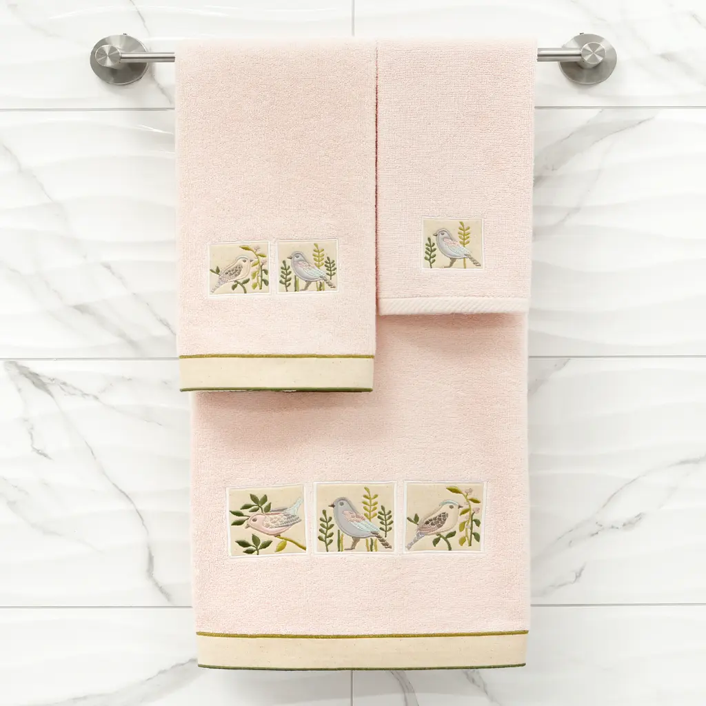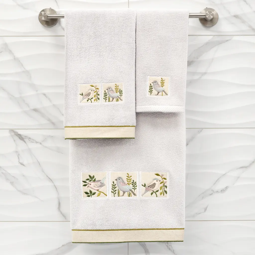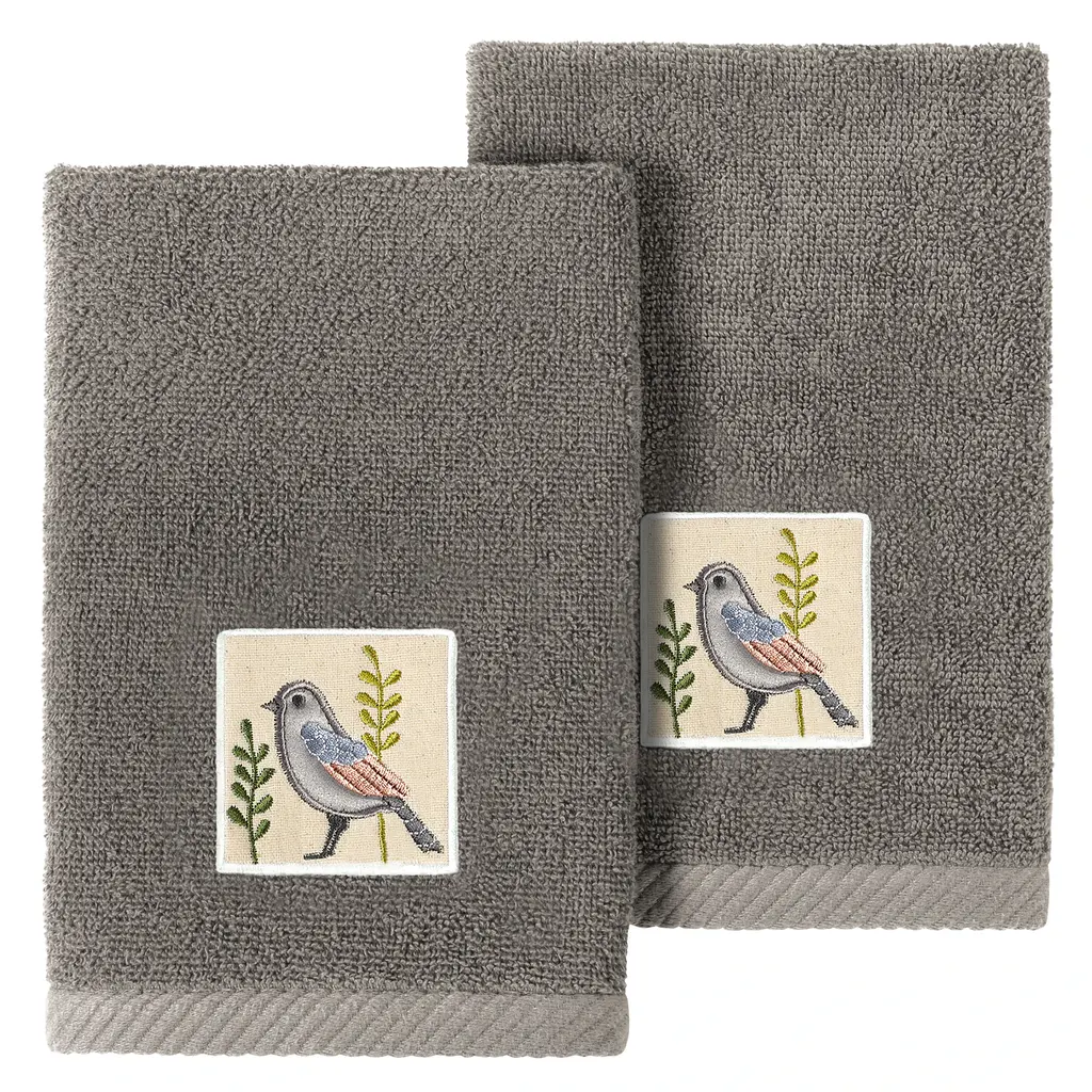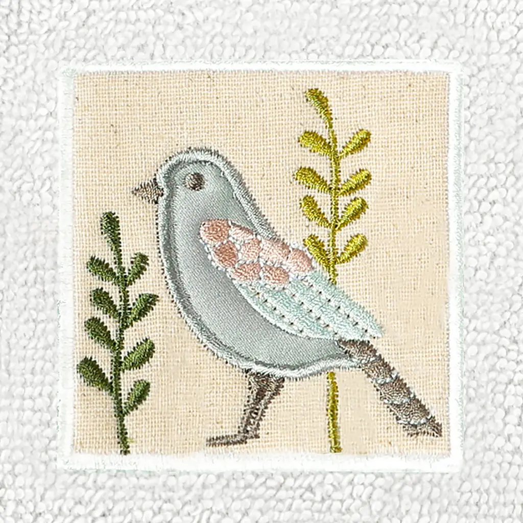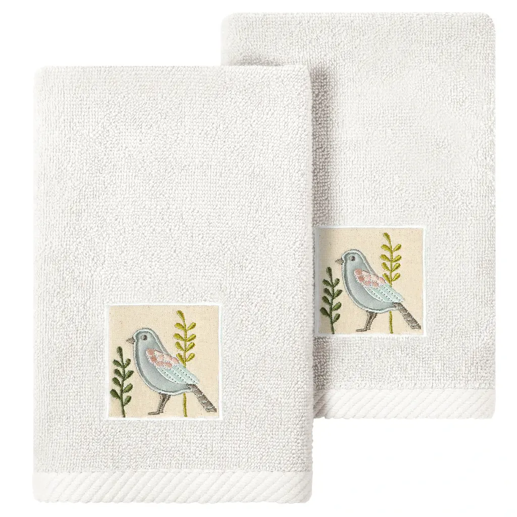 Your decorations are not complete without whimsical embroidered towels for the comfort of your family and guests. The Belinda towels feature charming applique birds and are trimmed with a muslin border. Cloud soft and super absorbent, these luxurious, durable towels keep their plush appearance after washing. This collection is available in 8 elegant colors: White, Beige, Blush, Aqua, Silver, Cocoa, Charcoal and Marine. The Belinda Towel Collection brings a country spirit and richness to your home decor and makes a great gift!Embroidered Birds design100% Premium Turkish CottonSuperbly absorbent and quick dryingAvailable in 8 elegant colorsMachine wash cold, No bleach, line dry or dry cleanSet includes 2 fingertip towels (11" x 18")Made in TurkeyProudly Embellished in USA