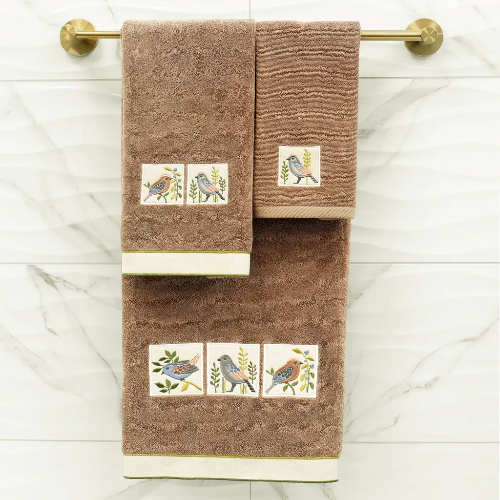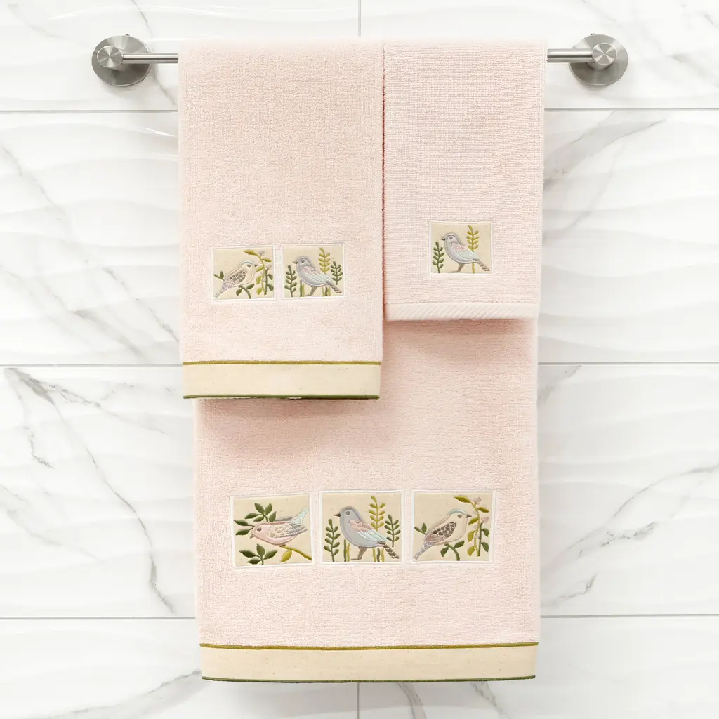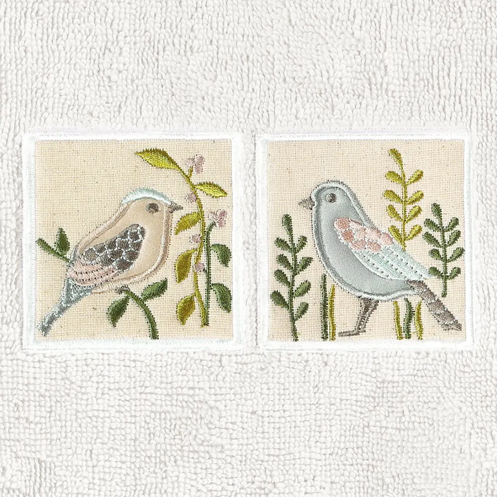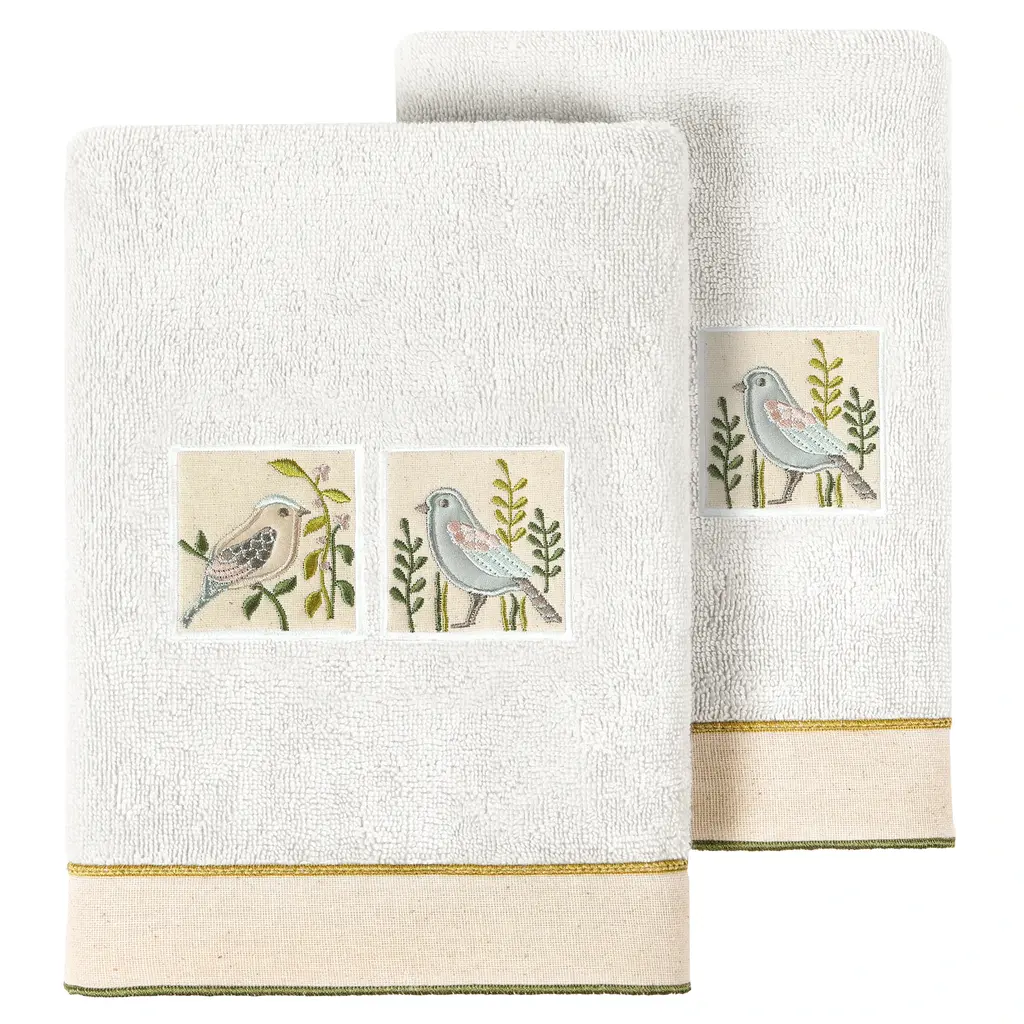 Your decorations are not complete without whimsical embroidered towels for the comfort of your family and guests. The Belinda towels feature charming applique birds and are trimmed with a muslin border. Cloud soft and super absorbent, these luxurious, durable towels keep their plush appearance after washing. This collection is available in 8 elegant colors: White, Beige, Blush, Aqua, Silver, Cocoa, Charcoal and Marine. The Belinda Towel Collection brings a country spirit and richness to your home decor and makes a great gift!Embroidered Birds design100% Premium Turkish CottonSuperbly absorbent and quick dryingAvailable in 8 elegant colorsMachine wash cold, No bleach, line dry or dry cleanSet includes 2 hand towels (16" x 30")Made in TurkeyProudly Embellished in USA