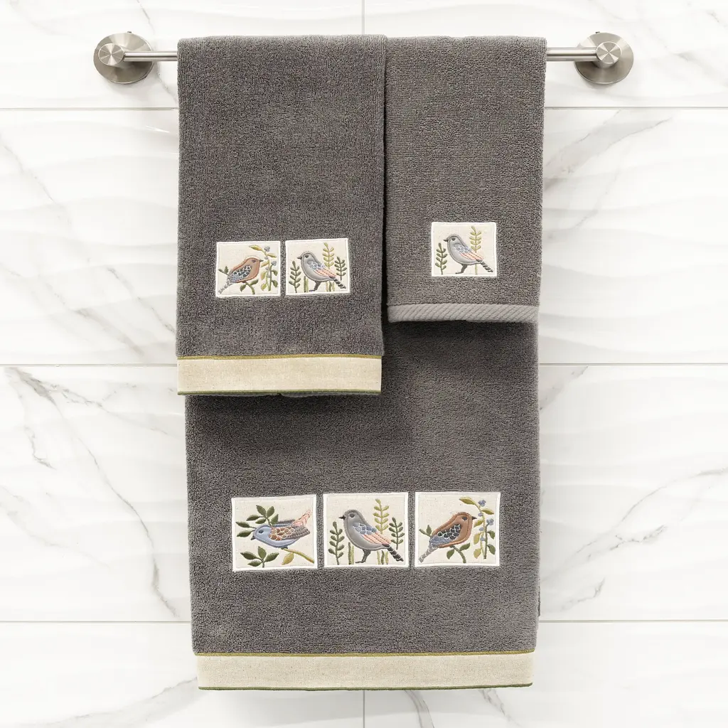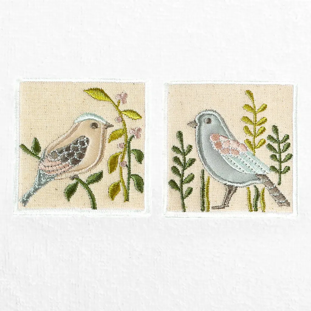 Your decorations are not complete without whimsical embroidered towels for the comfort of your family and guests. The Belinda towels feature charming applique birds and are trimmed with a muslin border. Cloud soft and super absorbent, these luxurious, durable towels keep their plush appearance after washing. This collection is available in 8 elegant colors: White, Beige, Blush, Aqua, Silver, Cocoa, Charcoal and Marine. The Belinda Towel Collection brings a country spirit and richness to your home decor and makes a great gift!Embroidered Birds design100% Premium Turkish CottonSuperbly absorbent and quick dryingAvailable in 8 elegant colorsMachine wash cold, No bleach, line dry or dry cleanSet includes 2 hand towels (16" x 30")Made in TurkeyProudly Embellished in USA