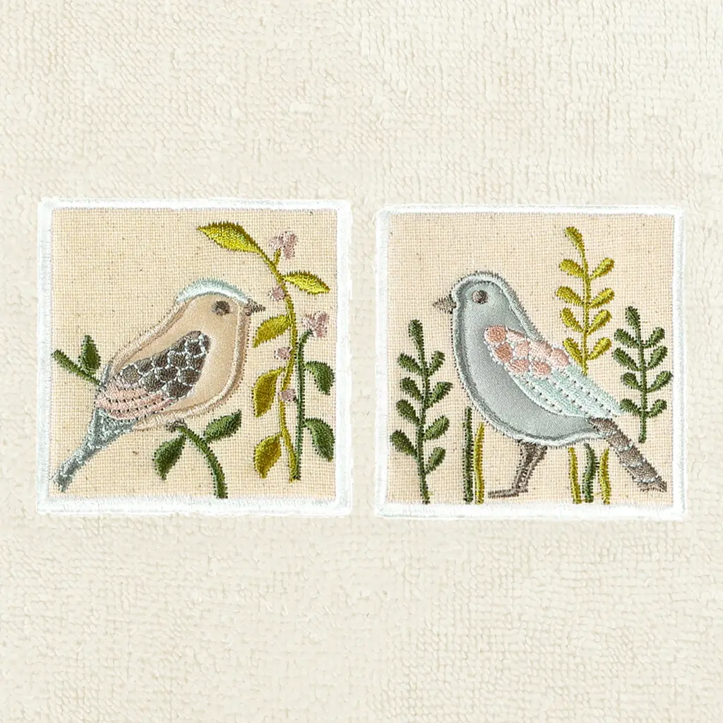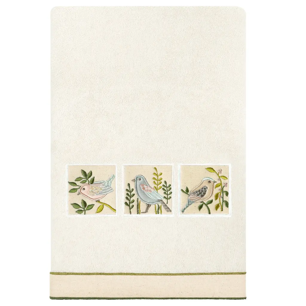 Your decorations are not complete without whimsical embroidered towels for the comfort of your family and guests. The Belinda towels feature charming applique birds and are trimmed with a muslin border. Cloud soft and super absorbent, these luxurious, durable towels keep their plush appearance after washing. This collection is available in 8 elegant colors: White, Beige, Blush, Aqua, Silver, Cocoa, Charcoal and Marine. The Belinda Towel Collection brings a country spirit and richness to your home decor and makes a great gift!Embroidered Birds design100% Premium Turkish CottonSuperbly absorbent and quick dryingAvailable in 8 elegant colorsMachine wash cold, No bleach, line dry or dry cleanSet includes 2 bath towels (27" x 54") / 2 hand towels (16" x 30")Made in TurkeyProudly Embellished in USA