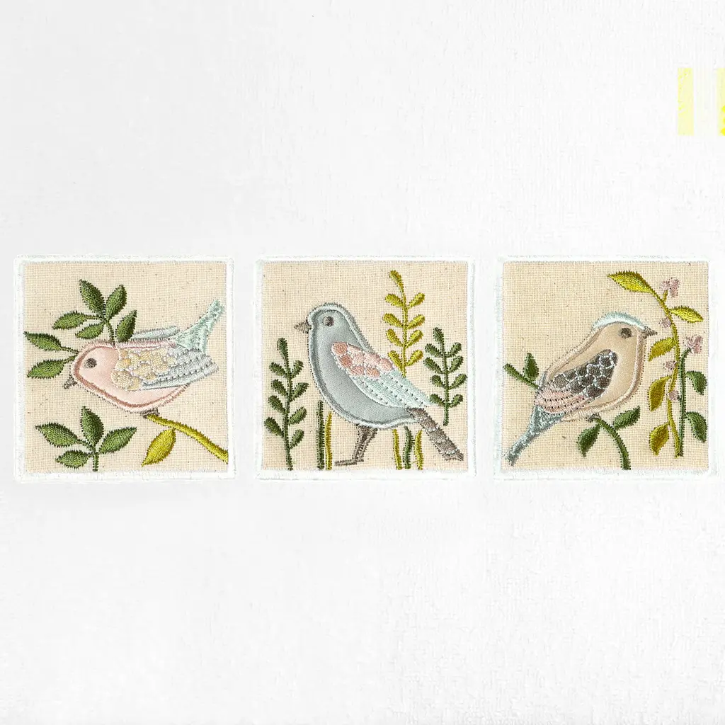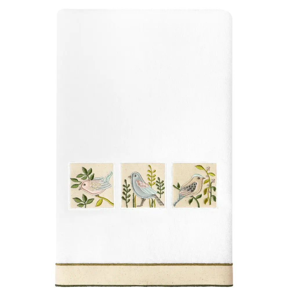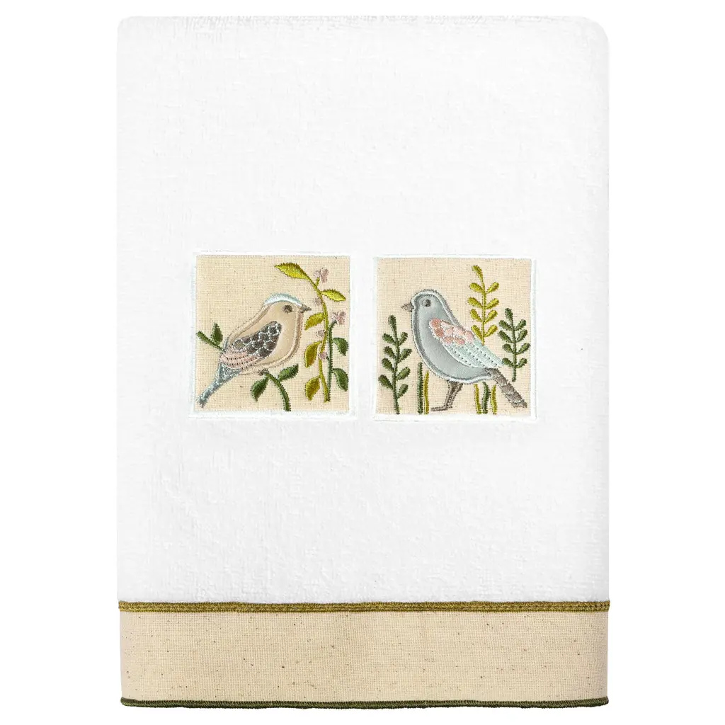 Your decorations are not complete without whimsical embroidered towels for the comfort of your family and guests. The Belinda towels feature charming applique birds and are trimmed with a muslin border. Cloud soft and super absorbent, these luxurious, durable towels keep their plush appearance after washing. This collection is available in 8 elegant colors: White, Beige, Blush, Aqua, Silver, Cocoa, Charcoal and Marine. The Belinda Towel Collection brings a country spirit and richness to your home decor and makes a great gift!Embroidered Birds design100% Premium Turkish CottonSuperbly absorbent and quick dryingAvailable in 8 elegant colorsMachine wash cold, No bleach, line dry or dry cleanSet includes 2 bath towels (27" x 54") / 2 hand towels (16" x 30")Made in TurkeyProudly Embellished in USA