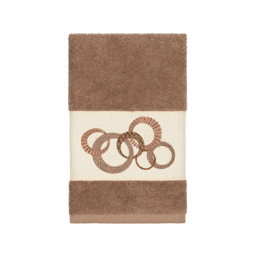 This authentic hotel and spa 4-piece towel set is made from plush, high end Turkish cotton for supreme absorbency and durability. The beautiful latte brown towels are embellished with a circles embroidery design with metallic accents to add that special touch to your bathroom.Includes: Two (2) bath towels and two (2) hand towels100-percent soft and absorbent Turkish cottonEmbellished with an embroidered designThese luxurious towel are produced in a state of the art green factory in Turkey which runs on 100-percent solar energyCare instructions: Machine wash and dryMade in TurkeyDimensions: Bath towel - 27 inches wide x 54 inches long; Hand towel - 16 inches wide x 30 inches long
