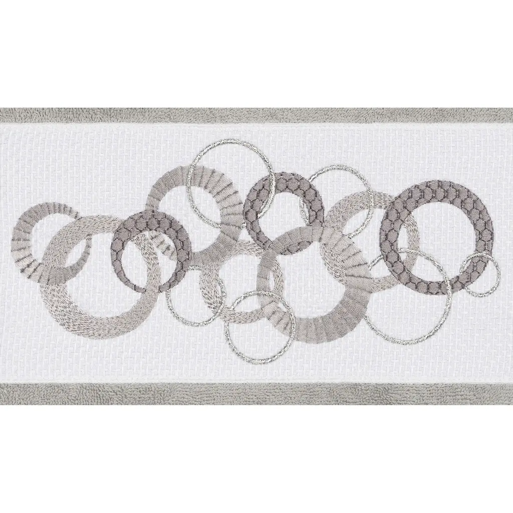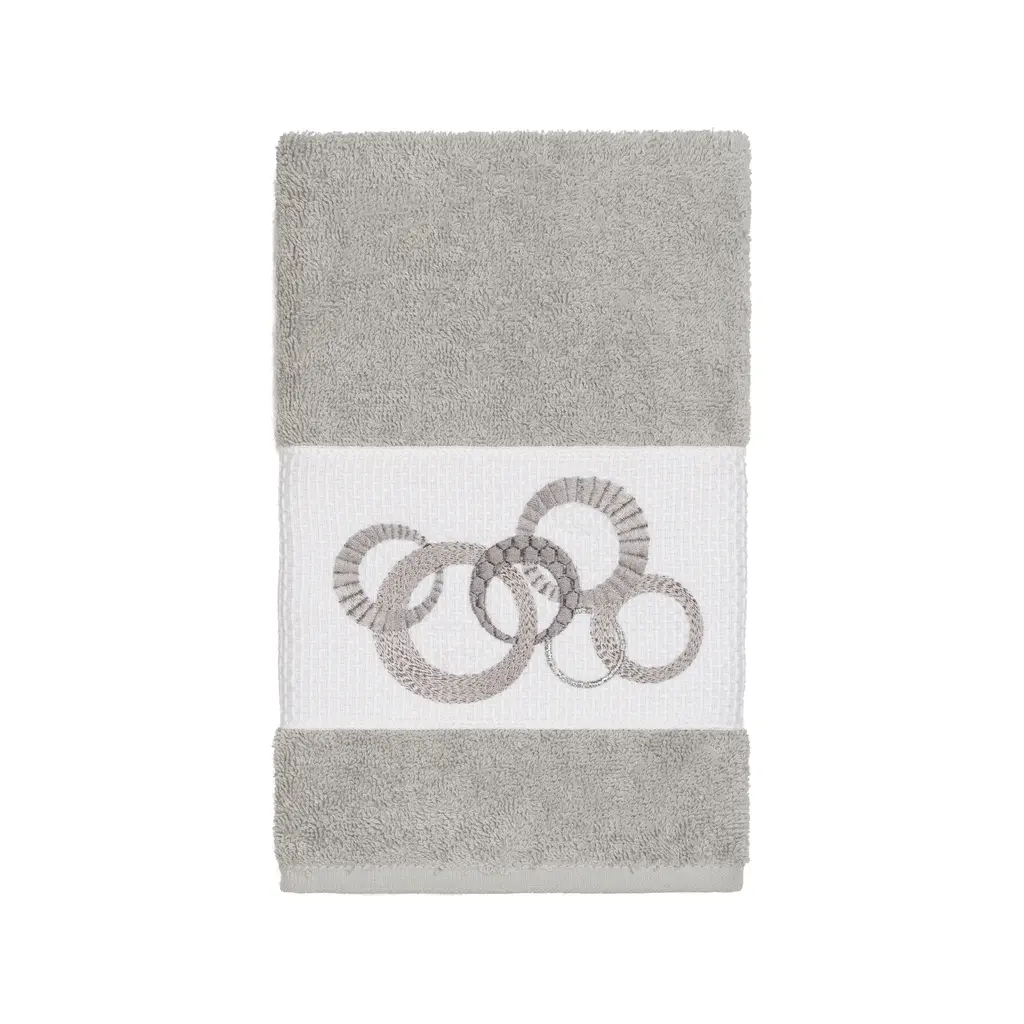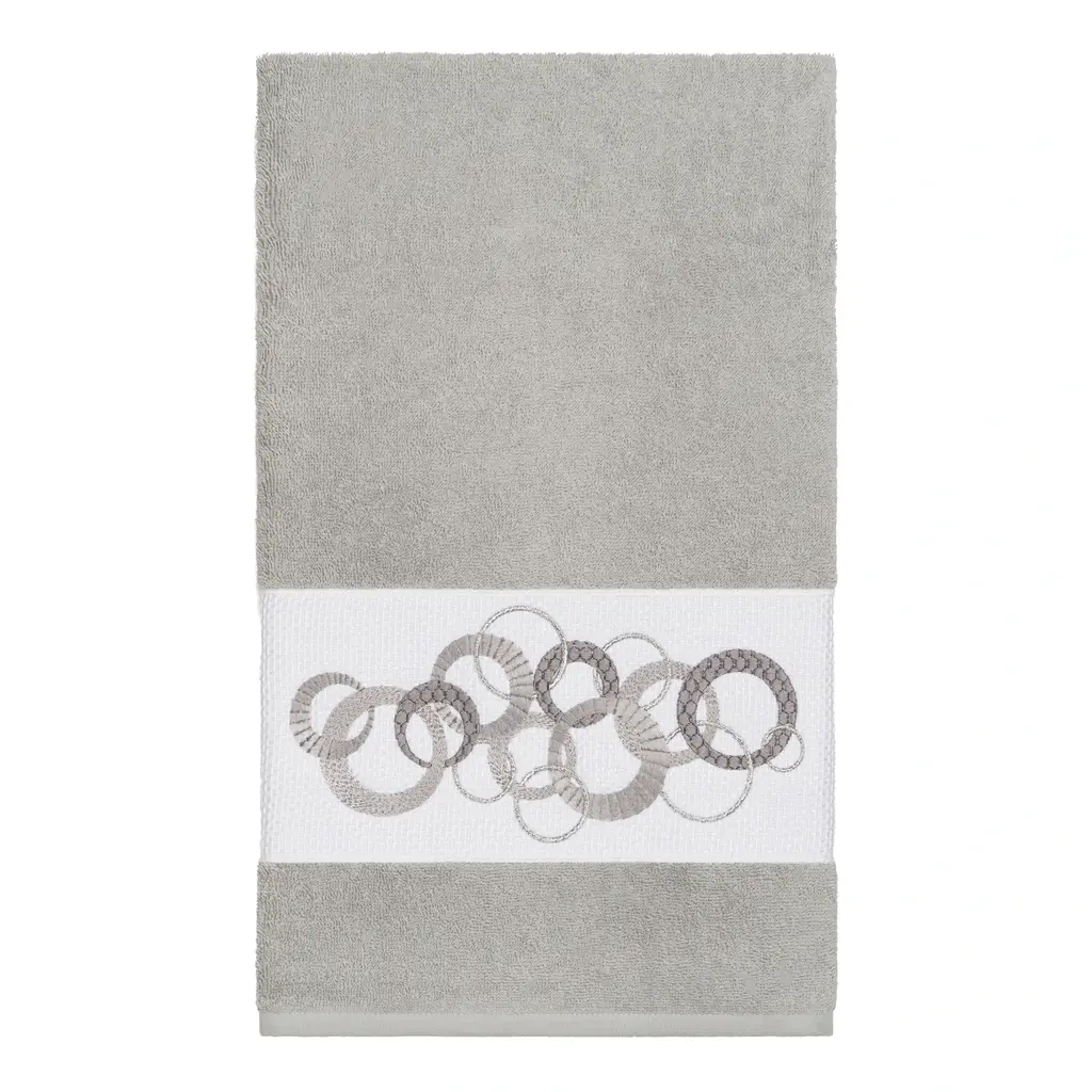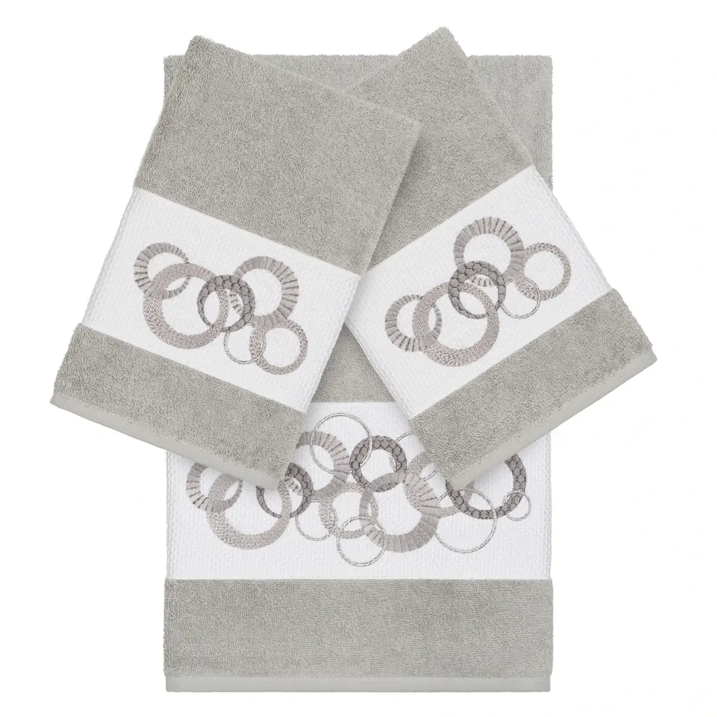 This authentic hotel and spa 3-piece towel set is made from plush, high end Turkish cotton for supreme absorbency and durability. The beautiful light grey towels are embellished with a circles embroidery design with metallic accents to add that special touch to your bathroom.Includes: One (1) bath towel and two (2) hand towels100-percent soft and absorbent Turkish cottonEmbellished with an embroidered designThese luxurious towel are produced in a state of the art green factory in Turkey which runs on 100-percent solar energyCare instructions: Machine wash and dryMade in TurkeyDimensions: Bath towel - 27 inches wide x 54 inches long; Hand towel - 16 inches wide x 30 inches long