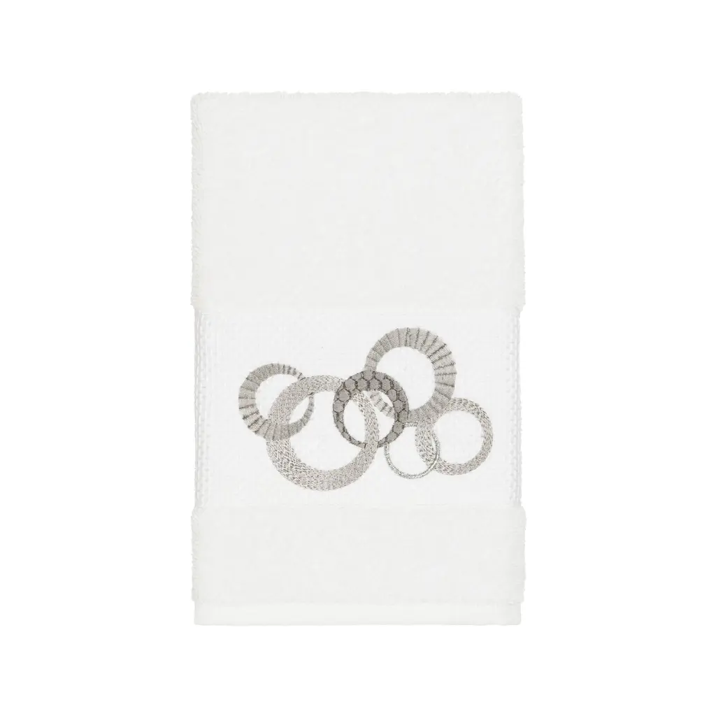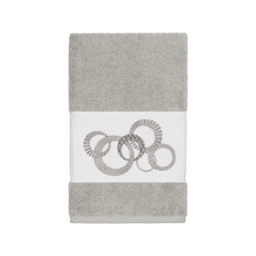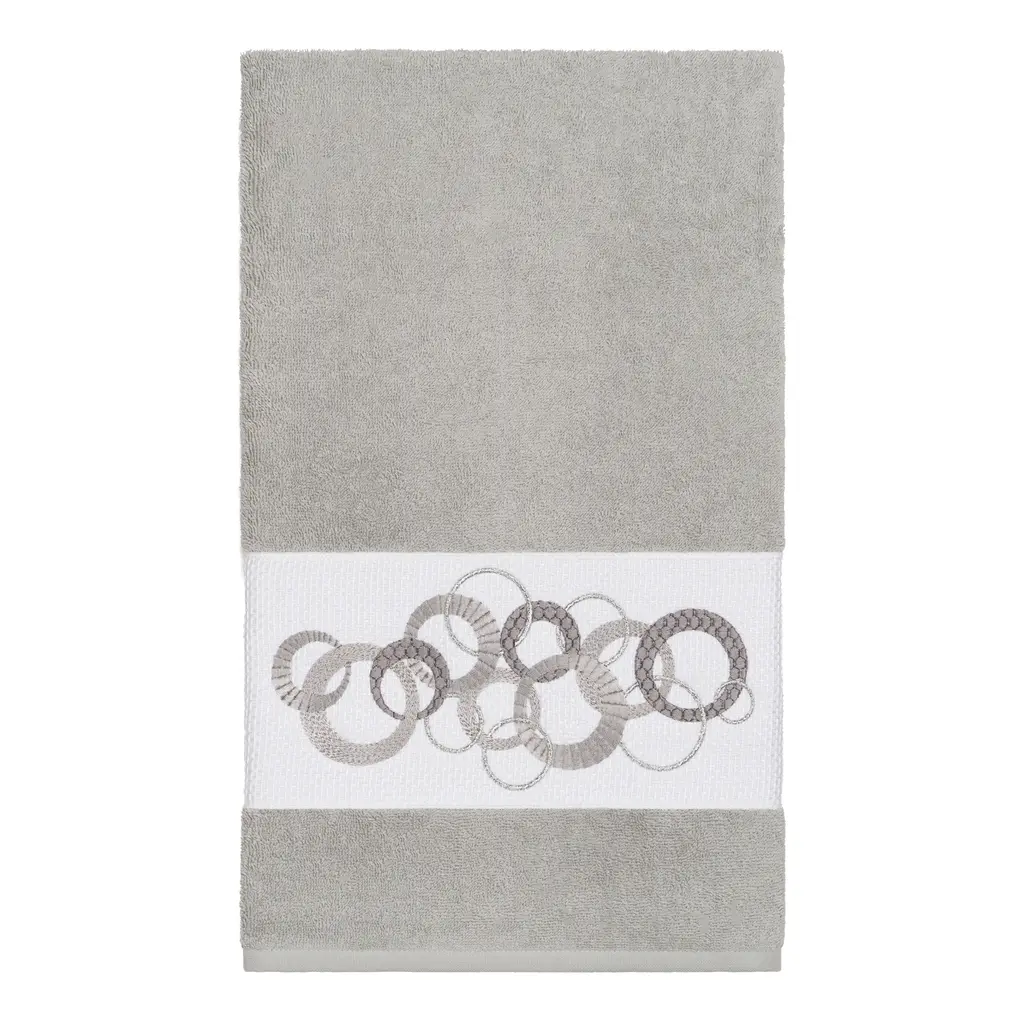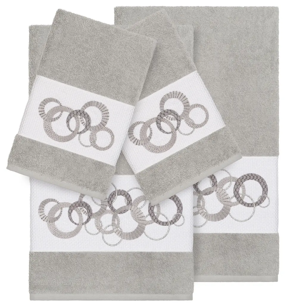 This authentic hotel and spa 4-piece towel set is made from plush, high end Turkish cotton for supreme absorbency and durability. The beautiful light grey towels are embellished with a circles embroidery design with metallic accents to add that special touch to your bathroom.Includes: Two (2) bath towels and two (2) hand towels100-percent soft and absorbent Turkish cottonEmbellished with an embroidered designThese luxurious towel are produced in a state of the art green factory in Turkey which runs on 100-percent solar energyCare instructions: Machine wash and dryMade in TurkeyDimensions: Bath towel - 27 inches wide x 54 inches long; Hand towel - 16 inches wide x 30 inches long