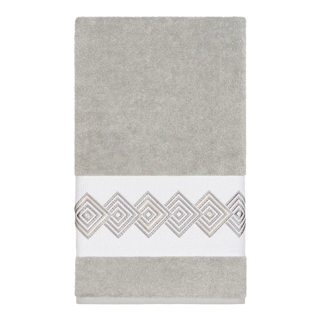 This authentic hotel and spa 8-piece towel set is made from plush, high end Turkish cotton for supreme absorbency and durability. The beautiful light grey towels are embellished with an overlapping diamonds embroidery design to add that special touch to your bathroom.Includes: Four (4) bath towels and four (4) hand towels100-percent soft and absorbent Turkish cottonEmbellished with an embroidered designThese luxurious towel are produced in a state of the art green factory in Turkey which runs on 100-percent solar energyCare instructions: Machine wash and dryMade in TurkeyDimensions: Bath towel - 27 inches wide x 54 inches long; Hand towel - 16 inches wide x 30 inches long