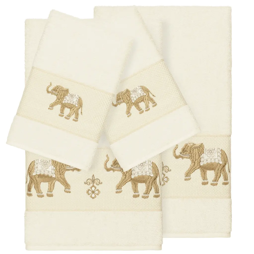 Authentic Hotel And Spa Turkish Cotton Elephants Embroidered Cream 4-Piece Towel Set - Cream