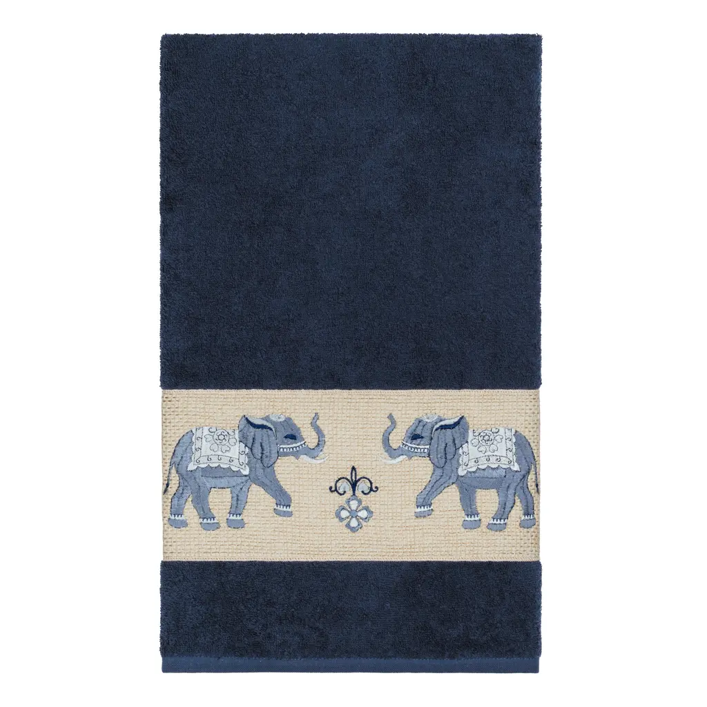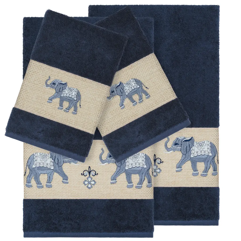Authentic Hotel And Spa Turkish Cotton Elephants Embroidered Midnight Blue 4-Piece Towel Set - Navy Blue