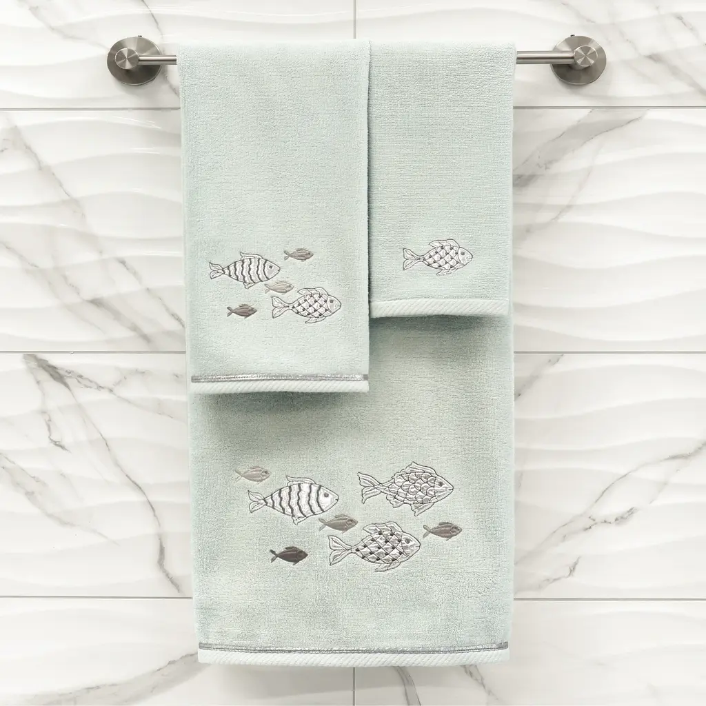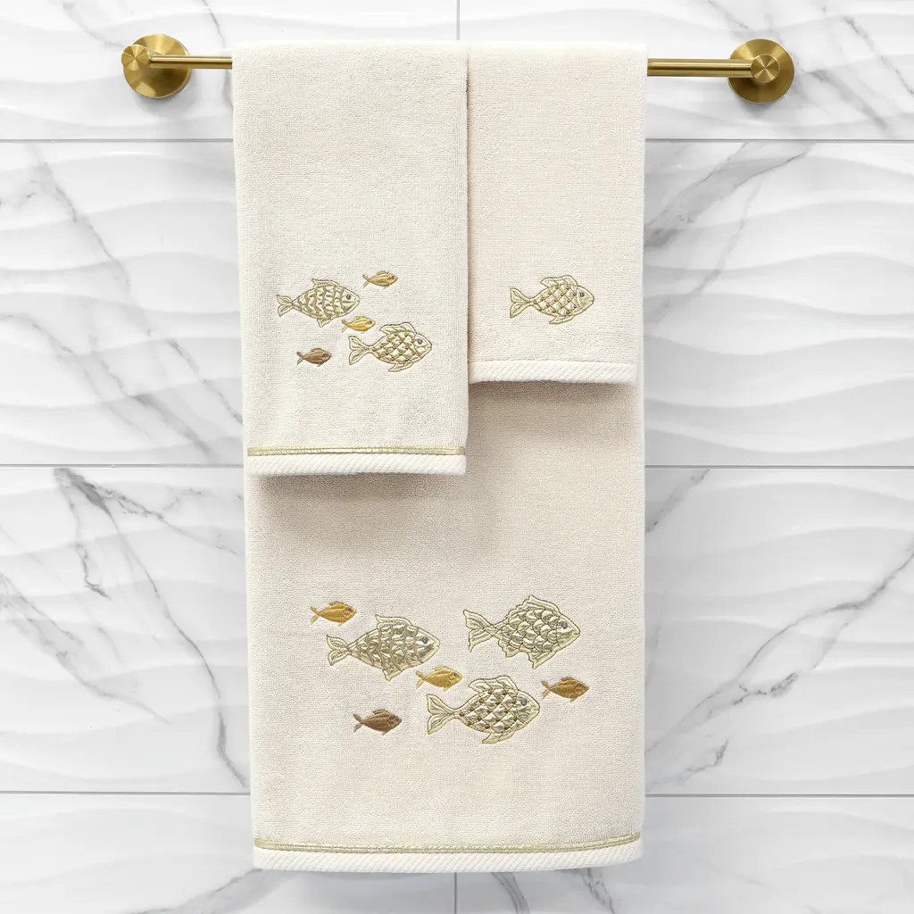 Your decorations are not complete without graceful embroidered towels for the comfort of your family and guests. The Figi towels by Authentic Hotel and Spa feature sparkling applique fish and are trimmed with a matching cord. Cloud soft and super absorbent, these luxurious, durable towels keep their plush appearance after washing. This collection is available in 8 elegant colors: White, Beige, Blush, Aqua, Silver, Cocoa, Charcoal and Marine. The Figi Towel Collection brings a coastal spirit and richness to your home decor and makes a great gift! Note: Due to variations in computer screen resolutions, slight color differences may exist between images provided and actual product.Embroidered Fish design100% Premium Turkish CottonSuperbly absorbent and quick dryingAvailable in 8 elegant colorsMachine wash cold, No bleach, line dry or dry cleanSet includes 2 hand towels (16" x 30")Made in TurkeyProudly Embellished in USA