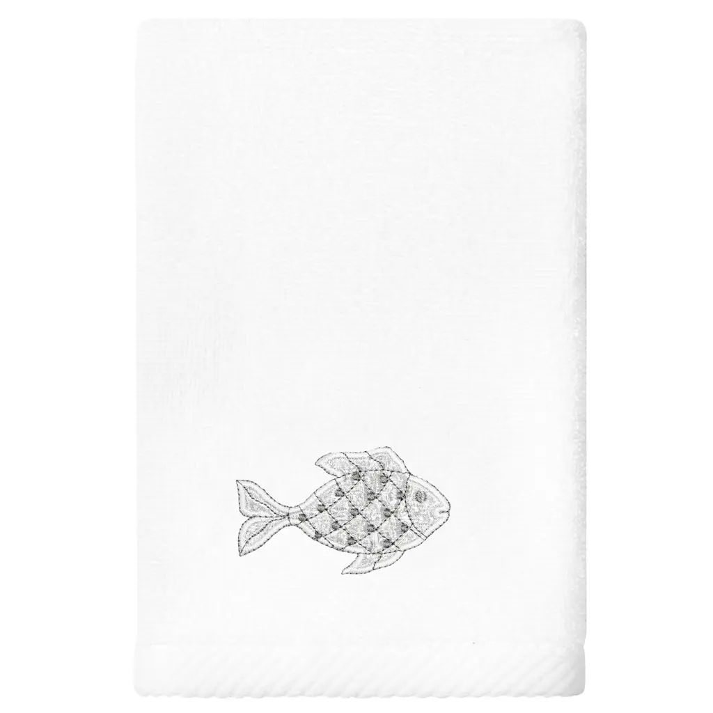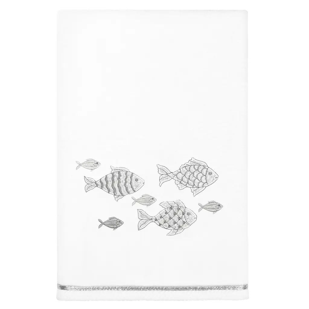 Your decorations are not complete without graceful embroidered towels for the comfort of your family and guests. The Figi towels by Authentic Hotel and Spa feature sparkling applique fish and are trimmed with a matching cord. Cloud soft and super absorbent, these luxurious, durable towels keep their plush appearance after washing. This collection is available in 8 elegant colors: White, Beige, Blush, Aqua, Silver, Cocoa, Charcoal and Marine. The Figi Towel Collection brings a coastal spirit and richness to your home decor and makes a great gift! Note: Due to variations in computer screen resolutions, slight color differences may exist between images provided and actual product.Embroidered Fish design100% Premium Turkish CottonSuperbly absorbent and quick dryingAvailable in 8 elegant colorsMachine wash cold, No bleach, line dry or dry cleanSet includes 1 bath towel (27" x 54") / 1 hand towel (16" x 30") / 1 fingertip towel (11" x 18")Made in TurkeyProudly Embellished in USA