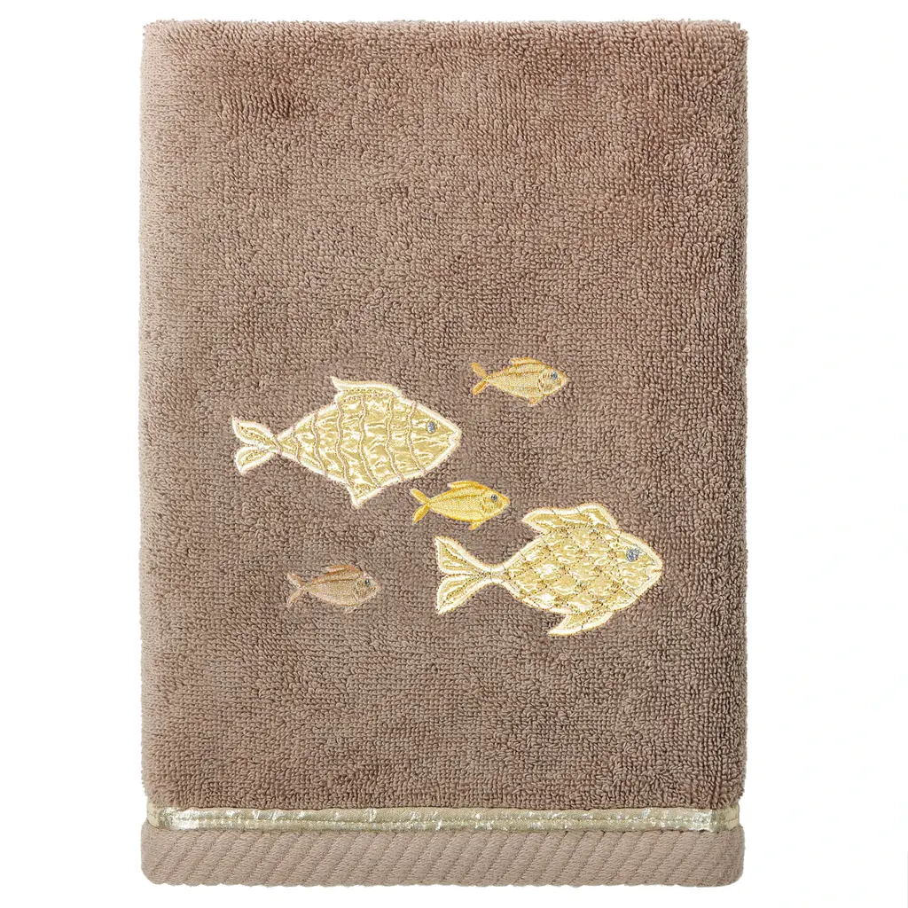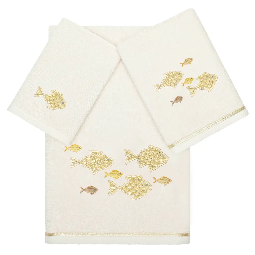 Your decorations are not complete without graceful embroidered towels for the comfort of your family and guests. The Figi towels by Authentic Hotel and Spa feature sparkling applique fish and are trimmed with a matching cord. Cloud soft and super absorbent, these luxurious, durable towels keep their plush appearance after washing. This collection is available in 8 elegant colors: White, Beige, Blush, Aqua, Silver, Cocoa, Charcoal and Marine. The Figi Towel Collection brings a coastal spirit and richness to your home decor and makes a great gift! Note: Due to variations in computer screen resolutions, slight color differences may exist between images provided and actual product.Embroidered Fish design100% Premium Turkish CottonSuperbly absorbent and quick dryingAvailable in 8 elegant colorsMachine wash cold, No bleach, line dry or dry cleanSet includes 2 bath towels (27" x 54") / 2 hand towels (16" x 30")Made in TurkeyProudly Embellished in USA