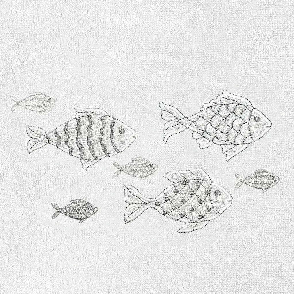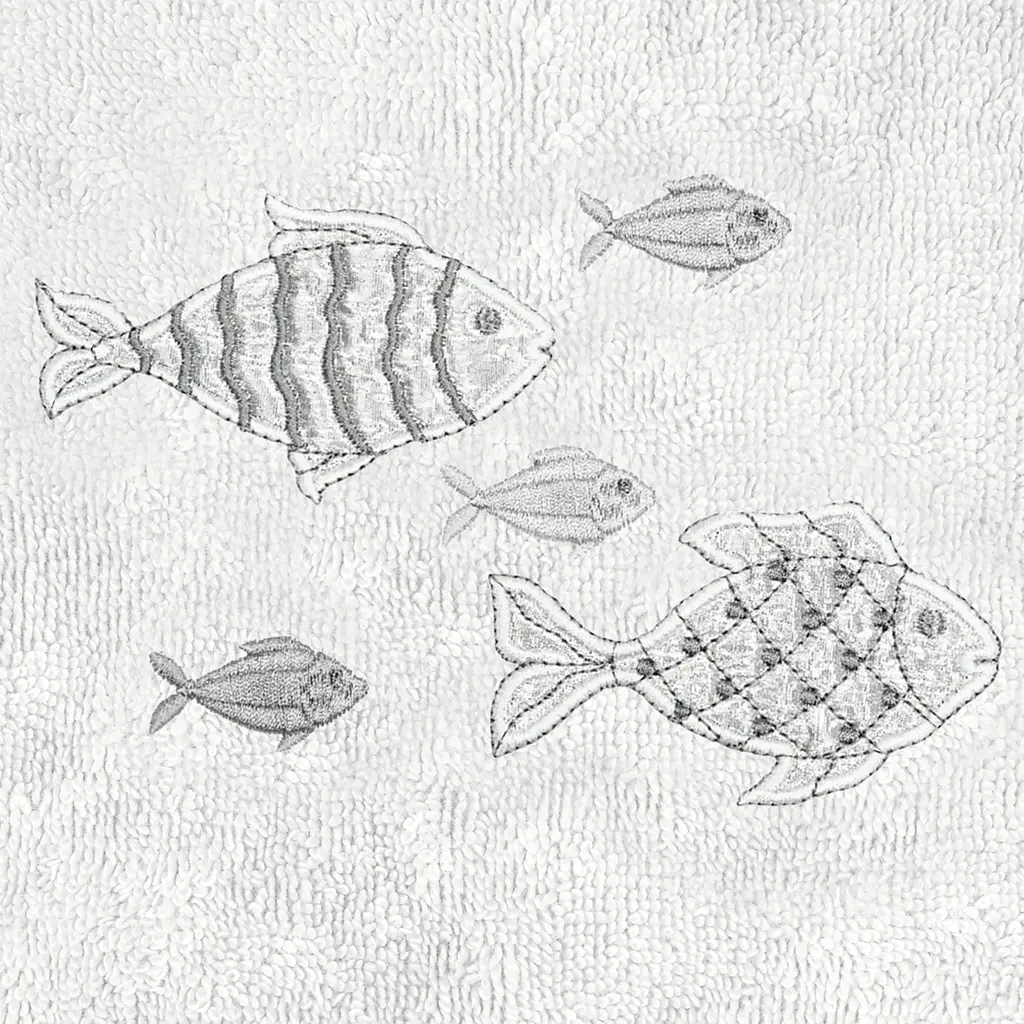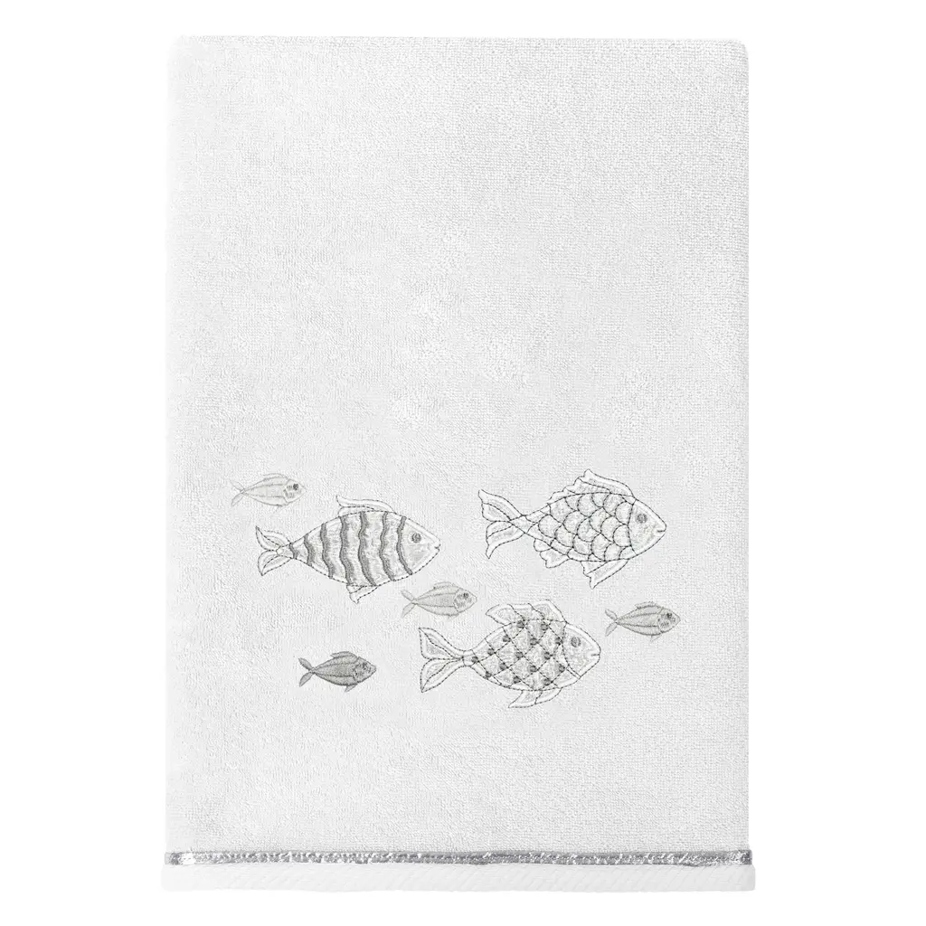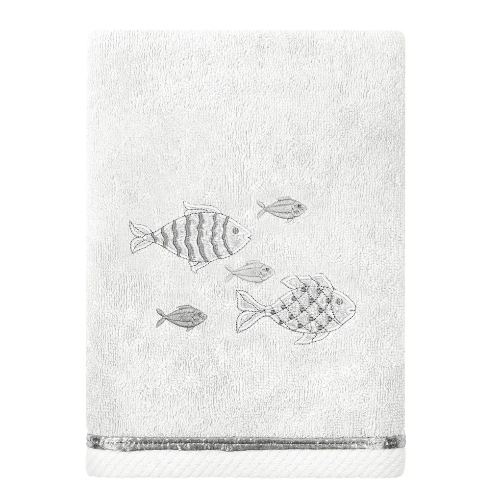 Your decorations are not complete without graceful embroidered towels for the comfort of your family and guests. The Figi towels by Authentic Hotel and Spa feature sparkling applique fish and are trimmed with a matching cord. Cloud soft and super absorbent, these luxurious, durable towels keep their plush appearance after washing. This collection is available in 8 elegant colors: White, Beige, Blush, Aqua, Silver, Cocoa, Charcoal and Marine. The Figi Towel Collection brings a coastal spirit and richness to your home decor and makes a great gift! Note: Due to variations in computer screen resolutions, slight color differences may exist between images provided and actual product.Embroidered Fish design100% Premium Turkish CottonSuperbly absorbent and quick dryingAvailable in 8 elegant colorsMachine wash cold, No bleach, line dry or dry cleanSet includes 2 bath towels (27" x 54") / 2 hand towels (16" x 30")Made in TurkeyProudly Embellished in USA
