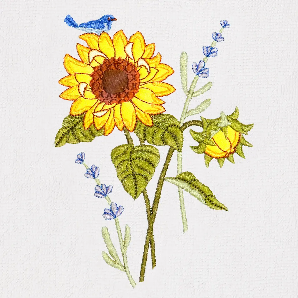 Create a mood of country charm in your bath with the Girasol Embellished Towel Collection by Authentic Hotel and Spa. These towels feature an applique embroidered bouquet of vibrant sunflowers and lavender, highlighted by a bright bird perched on top. Cloud soft and super absorbent, these luxurious, durable towels keep their plush appearance after washing. This collection is available in 8 elegant colors: White, Beige, Blush, Aqua, Silver, Cocoa, Charcoal and Marine. The Girasol Towel Collection brings a natural spirit and richness to your home decor and makes a great gift!Embroidered Bouquet design 100% Premium Turkish Cotton Superbly absorbent and quick drying Available in 8 elegant colors Machine wash cold, No bleach, line dry or dry clean Set includes 1 bath towel (27" x 54") / 2 hand towels (16" x 30") Made in Turkey Proudly Embellished in USA