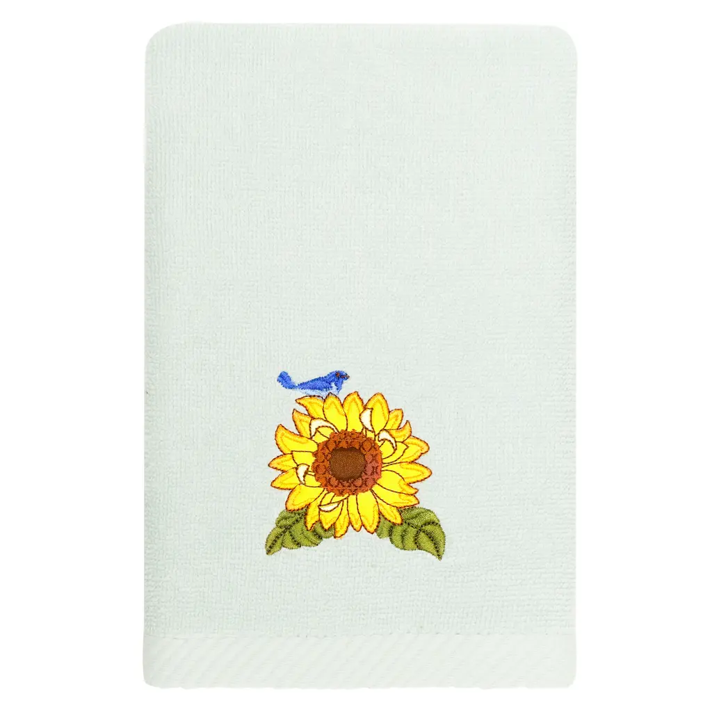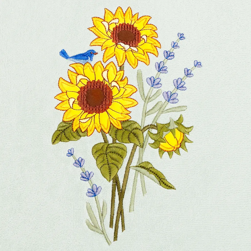 Create a mood of country charm in your bath with the Girasol Embellished Towel Collection by Authentic Hotel and Spa. These towels feature an applique embroidered bouquet of vibrant sunflowers and lavender, highlighted by a bright bird perched on top. Cloud soft and super absorbent, these luxurious, durable towels keep their plush appearance after washing. This collection is available in 8 elegant colors: White, Beige, Blush, Aqua, Silver, Cocoa, Charcoal and Marine. The Girasol Towel Collection brings a natural spirit and richness to your home decor and makes a great gift!Embroidered Bouquet design 100% Premium Turkish Cotton Superbly absorbent and quick drying Available in 8 elegant colors Machine wash cold, No bleach, line dry or dry clean Set includes 1 bath towel (27" x 54") / 1 hand towel (16" x 30") / 1 fingertip towel (11" x 18") Made in Turkey Proudly Embellished in USA