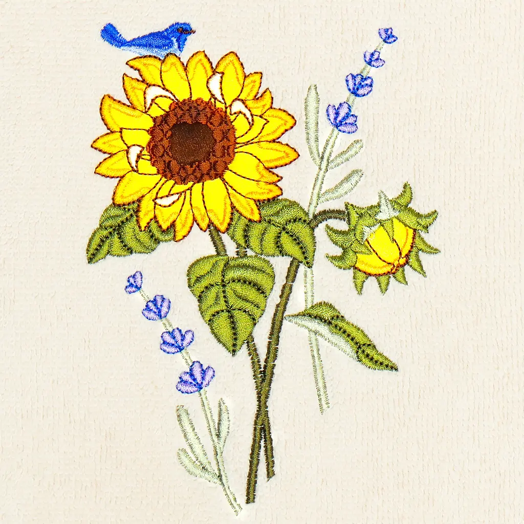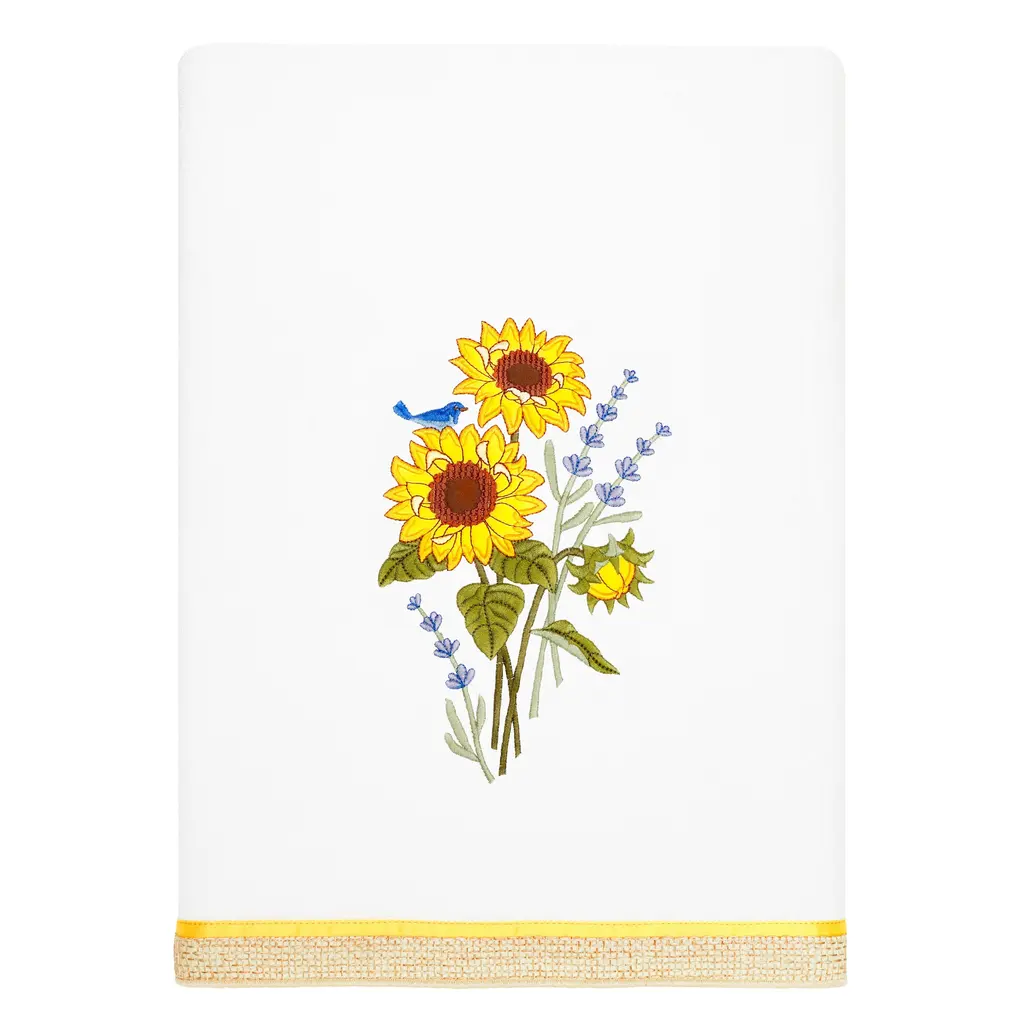 Create a mood of country charm in your bath with the Girasol Embellished Towel Collection by Authentic Hotel and Spa. These towels feature an applique embroidered bouquet of vibrant sunflowers and lavender, highlighted by a bright bird perched on top. Cloud soft and super absorbent, these luxurious, durable towels keep their plush appearance after washing. This collection is available in 8 elegant colors: White, Beige, Blush, Aqua, Silver, Cocoa, Charcoal and Marine. The Girasol Towel Collection brings a natural spirit and richness to your home decor and makes a great gift!Embroidered Bouquet design 100% Premium Turkish Cotton Superbly absorbent and quick drying Available in 8 elegant colors Machine wash cold, No bleach, line dry or dry clean Set includes 1 bath towel (27" x 54") / 1 hand towel (16" x 30") / 1 fingertip towel (11" x 18") Made in Turkey Proudly Embellished in USA