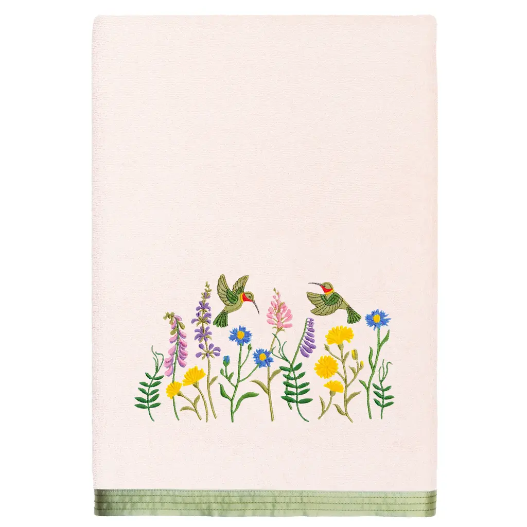 Your bath decor is not complete without a set of luxurious embroidered towels by Authentic Hotel and Spa for the comfort of your family and guests. The Hada towels feature applique hummingbirds, dancing among wild flowers and are trimmed with a lustrous taffeta border. Cloud soft and super absorbent, these luxurious, durable towels keep their plush appearance after washing. This collection is available in 8 elegant colors: White, Beige, Blush, Aqua, Silver, Cocoa, Charcoal and Marine. The Hada Towel Collection brings cheerful spirit and richness to your home decor and makes a great gift. Note: Due to variations in computer screen resolutions, slight color differences may exist between images provided and actual product.Embroidered Hummingbird and Flower design100% Premium Turkish CottonSuperbly absorbent and quick dryingAvailable in 8 elegant colorsMachine wash cold, No bleach, line dry or dry cleanSet includes 2 bath towels (27"" x 54"")Made in TurkeyProudly Embellished in USA