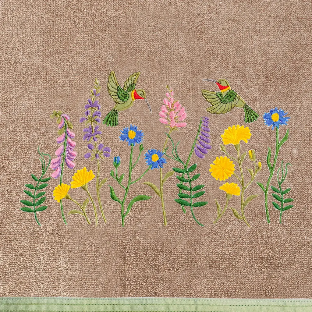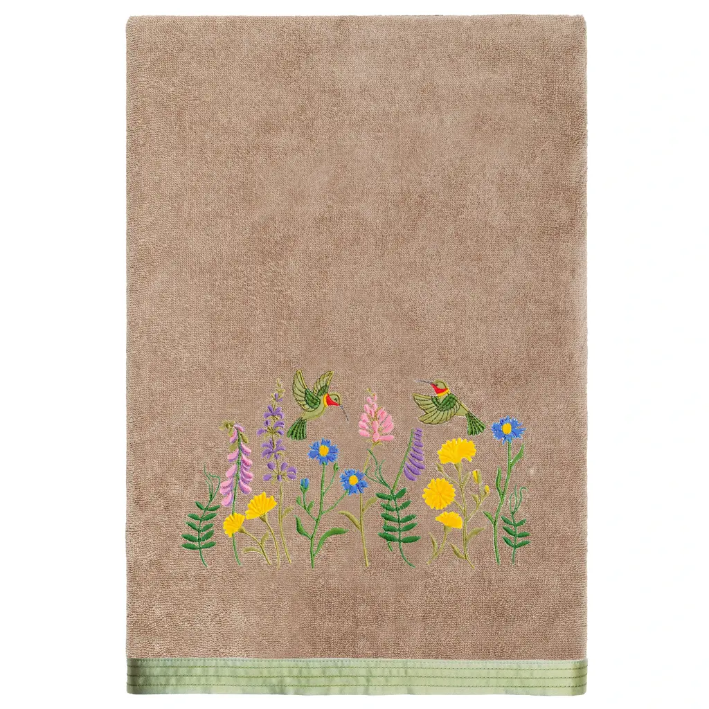 Your bath decor is not complete without a set of luxurious embroidered towels by Authentic Hotel and Spa for the comfort of your family and guests. The Hada towels feature applique hummingbirds, dancing among wild flowers and are trimmed with a lustrous taffeta border. Cloud soft and super absorbent, these luxurious, durable towels keep their plush appearance after washing. This collection is available in 8 elegant colors: White, Beige, Blush, Aqua, Silver, Cocoa, Charcoal and Marine. The Hada Towel Collection brings cheerful spirit and richness to your home decor and makes a great gift. Note: Due to variations in computer screen resolutions, slight color differences may exist between images provided and actual product.Embroidered Hummingbird and Flower design100% Premium Turkish CottonSuperbly absorbent and quick dryingAvailable in 8 elegant colorsMachine wash cold, No bleach, line dry or dry cleanSet includes 2 bath towels (27"" x 54"")Made in TurkeyProudly Embellished in USA