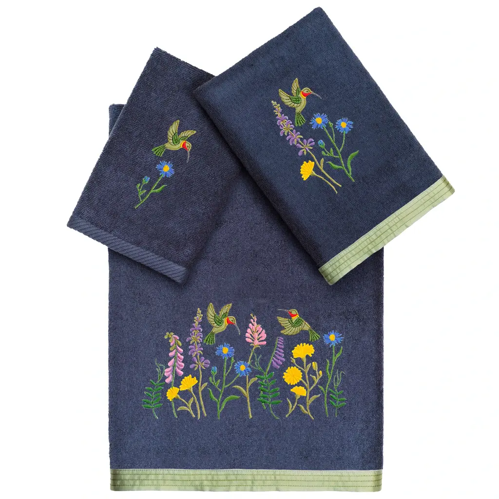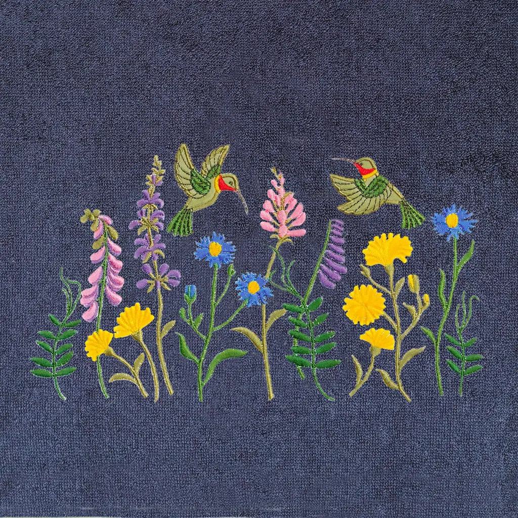 Your bath decor is not complete without a set of luxurious embroidered towels by Authentic Hotel and Spa for the comfort of your family and guests. The Hada towels feature applique hummingbirds, dancing among wild flowers and are trimmed with a lustrous taffeta border. Cloud soft and super absorbent, these luxurious, durable towels keep their plush appearance after washing. This collection is available in 8 elegant colors: White, Beige, Blush, Aqua, Silver, Cocoa, Charcoal and Marine. The Hada Towel Collection brings cheerful spirit and richness to your home decor and makes a great gift. Note: Due to variations in computer screen resolutions, slight color differences may exist between images provided and actual product.Embroidered Hummingbird and Flower design100% Premium Turkish CottonSuperbly absorbent and quick dryingAvailable in 8 elegant colorsMachine wash cold, No bleach, line dry or dry cleanSet includes 2 bath towels (27"" x 54"")Made in TurkeyProudly Embellished in USA