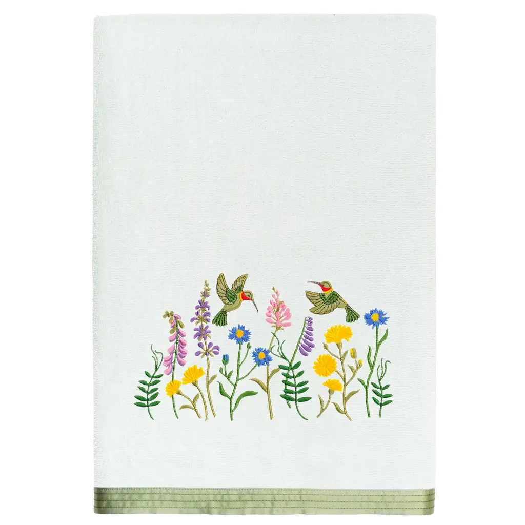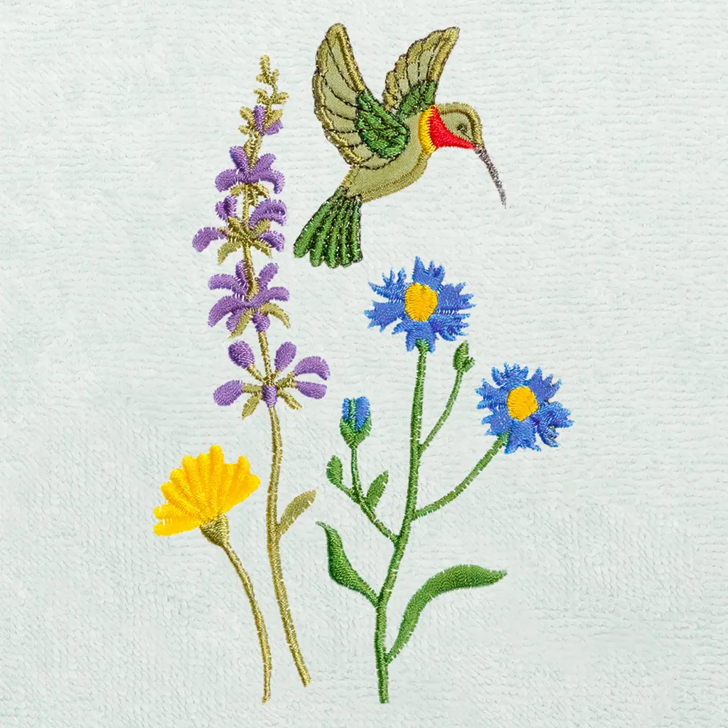 Your bath decor is not complete without delightful embroidered towels by Authentic Hotel and Spa for the comfort of your family and guests. The Hada towels feature applique hummingbirds, dancing among wild flowers and are trimmed with a lustrous taffeta border. Cloud soft and super absorbent, these luxurious, durable towels keep their plush appearance after washing. This collection is available in 8 elegant colors: White, Beige, Blush, Aqua, Silver, Cocoa, Charcoal and Marine. The Hada Towel Collection brings cheerful spirit and richness to your home decor and makes a great gift. Note: Due to variations in computer screen resolutions, slight color differences may exist between images provided and actual product.Embroidered Hummingbird and Flower design100% Premium Turkish CottonSuperbly absorbent and quick dryingAvailable in 8 elegant colorsMachine wash cold, No bleach, line dry or dry cleanSet includes 1 bath towel (27" x 54") / 2 hand towels (16" x 30")Made in TurkeyProudly Embellished in USA