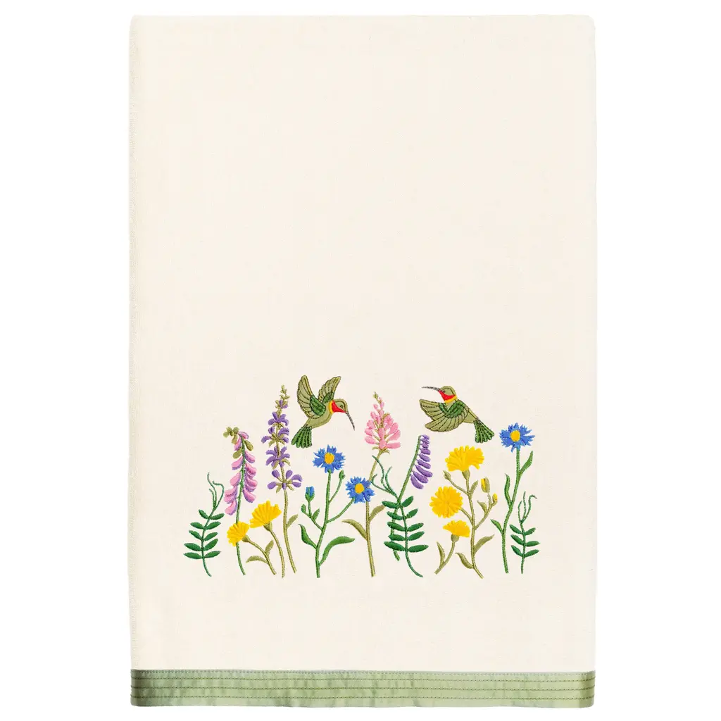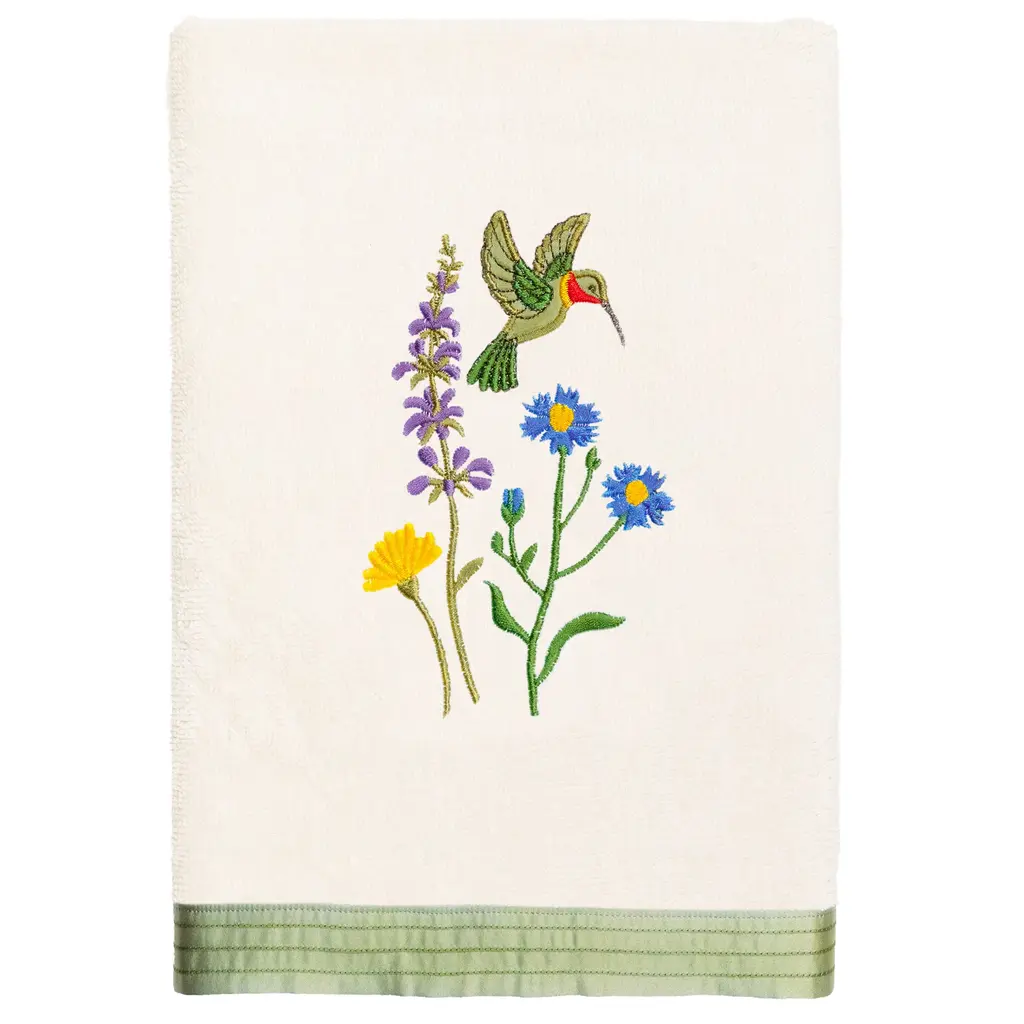 Your bath decor is not complete without delightful embroidered towels by Authentic Hotel and Spa for the comfort of your family and guests. The Hada towels feature applique hummingbirds, dancing among wild flowers and are trimmed with a lustrous taffeta border. Cloud soft and super absorbent, these luxurious, durable towels keep their plush appearance after washing. This collection is available in 8 elegant colors: White, Beige, Blush, Aqua, Silver, Cocoa, Charcoal and Marine. The Hada Towel Collection brings cheerful spirit and richness to your home decor and makes a great gift. Note: Due to variations in computer screen resolutions, slight color differences may exist between images provided and actual product.Embroidered Hummingbird and Flower design100% Premium Turkish CottonSuperbly absorbent and quick dryingAvailable in 8 elegant colorsMachine wash cold, No bleach, line dry or dry cleanSet includes 1 bath towel (27" x 54") / 2 hand towels (16" x 30")Made in TurkeyProudly Embellished in USA
